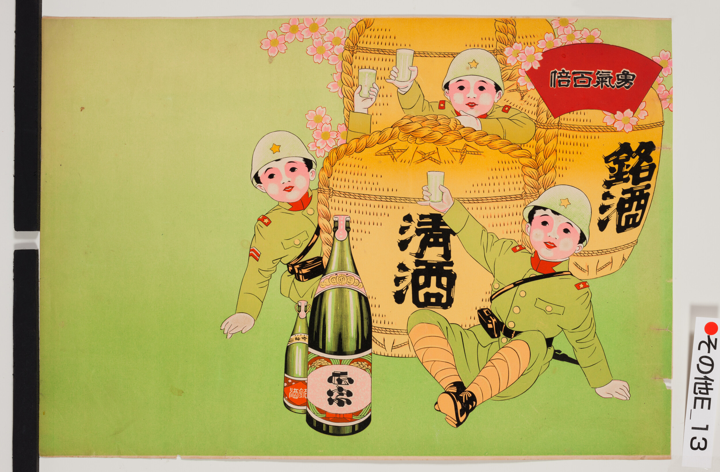 引札(名入れ前)酒樽の前でコップを持った少年兵士 「勇気百倍」「銘酒」「清酒」「正宗」の文字あり