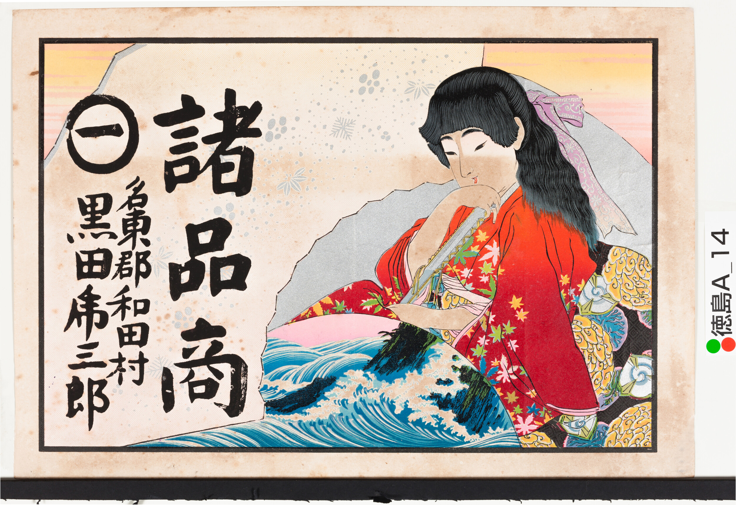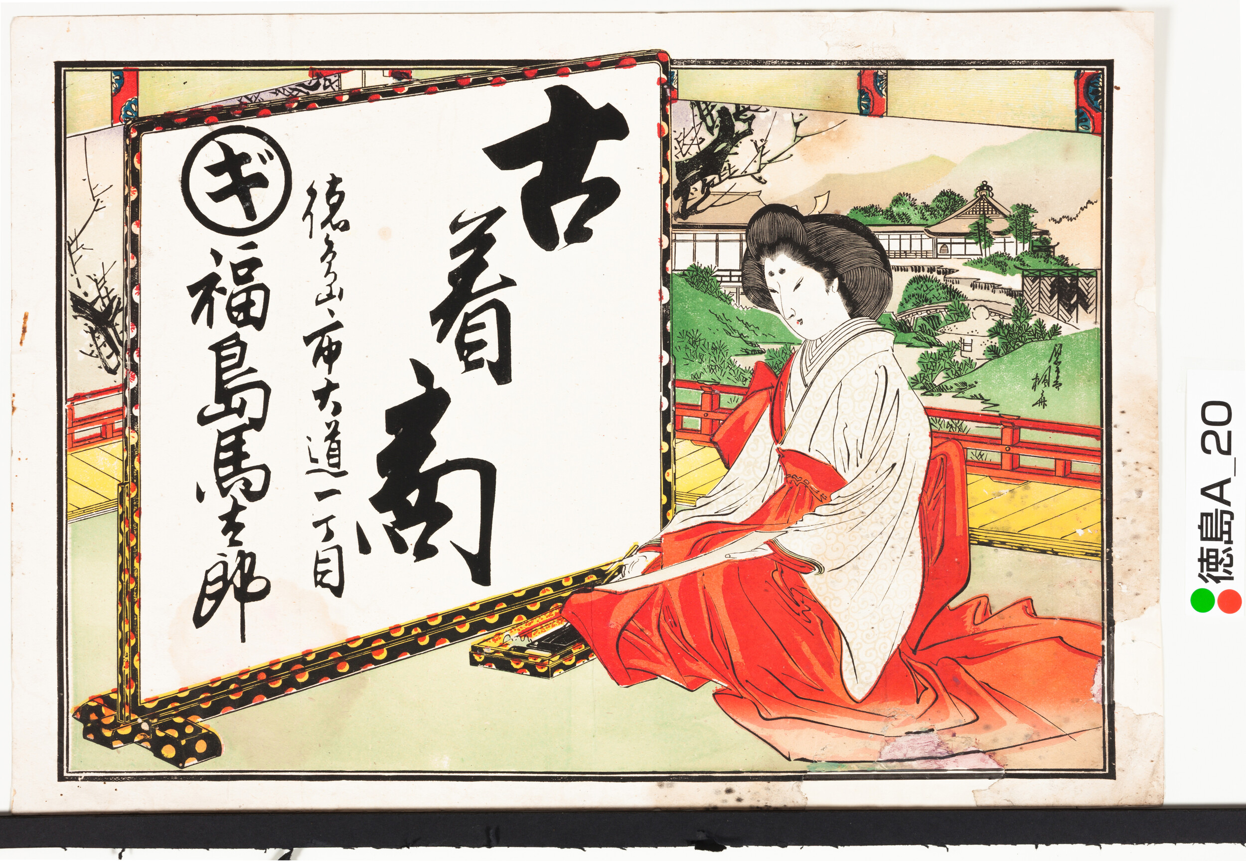 引札絵柄:緋袴の美人 短冊に筆文字、女官 商店場所:徳島市大道1丁目 商店名称:福島馬太郎 商売内容:古着商
