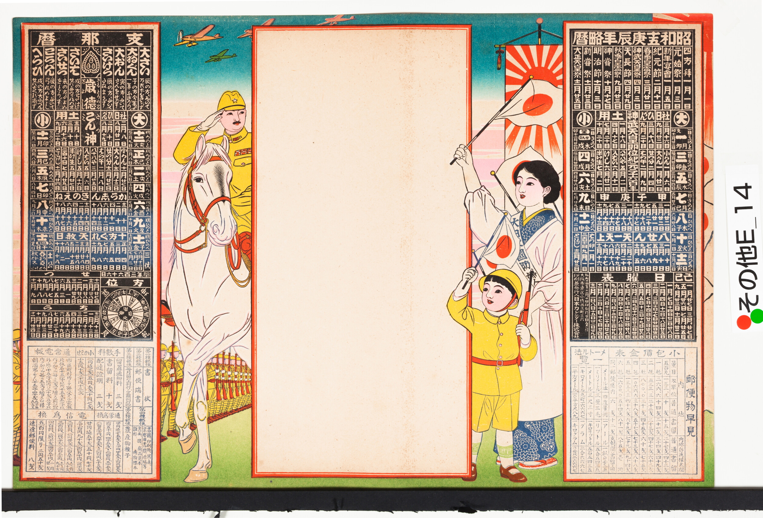 引札暦(名入れ前)日の丸振りて 大日本国防婦人会の襷 昭和15年略暦 郵便物早見表