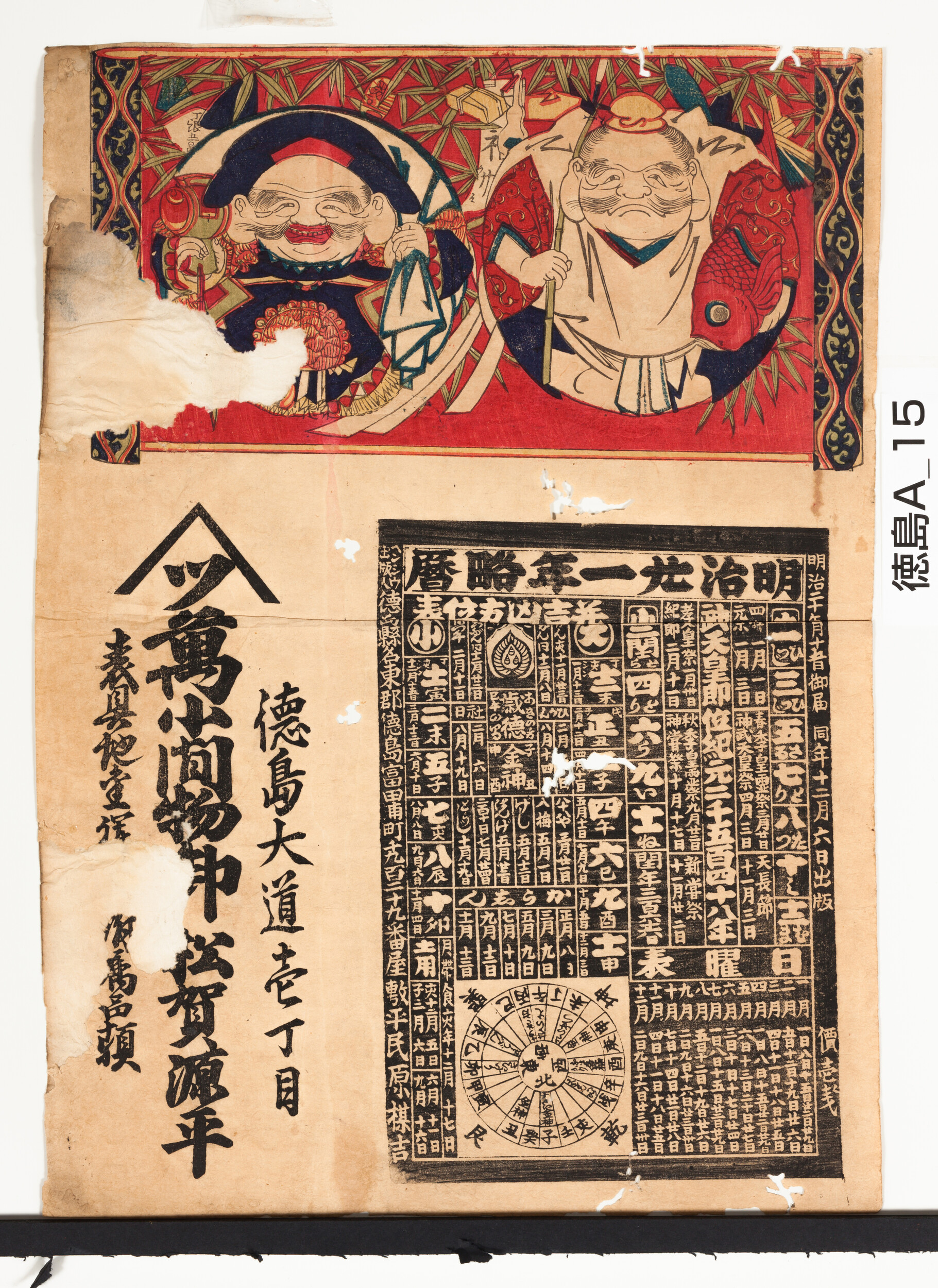 引札暦:明治21年略暦恵比寿と大黒 商店場所:徳島大道1丁目 商店名称:松賀源平 商売内容:表具□□付属品類