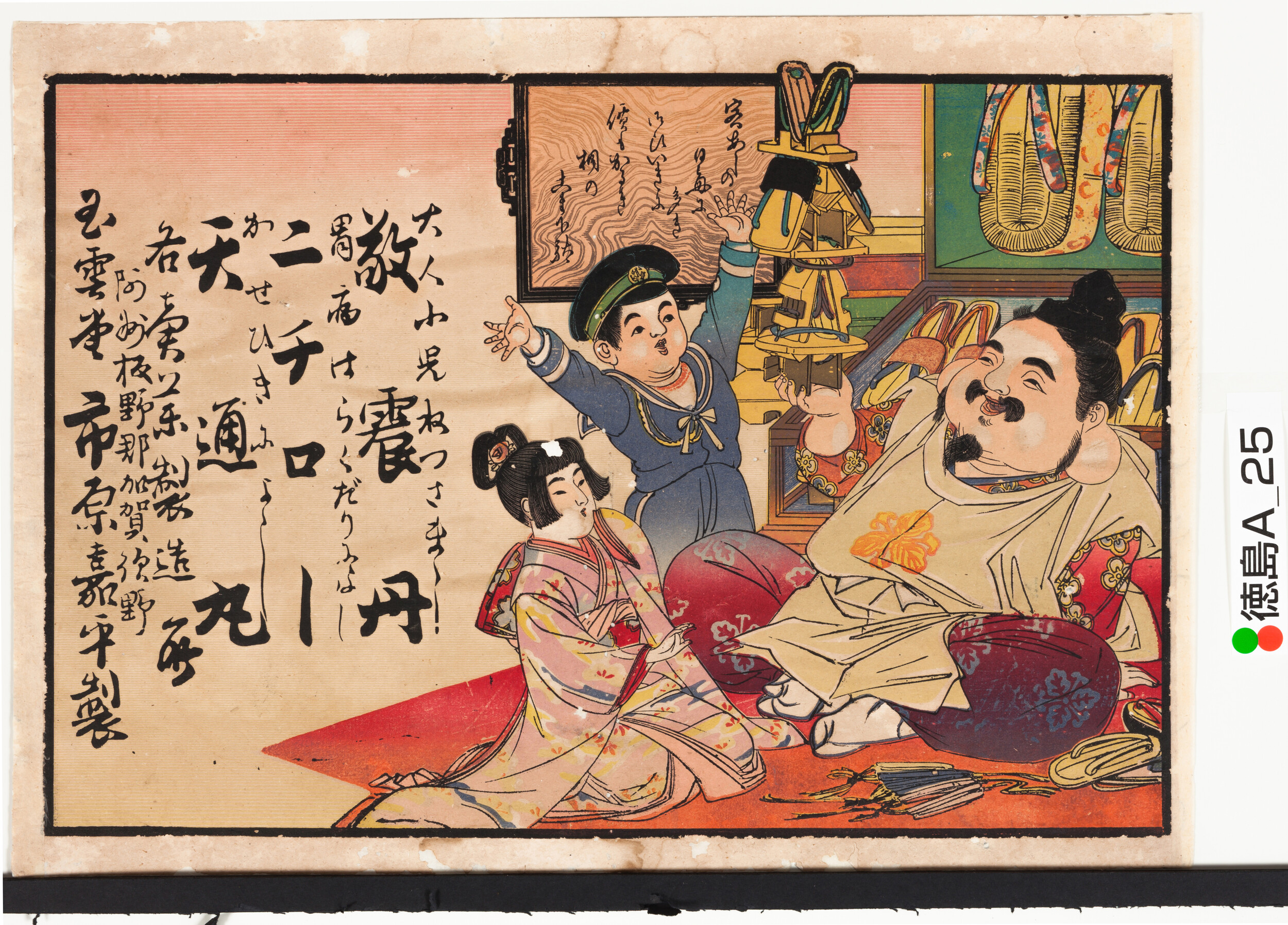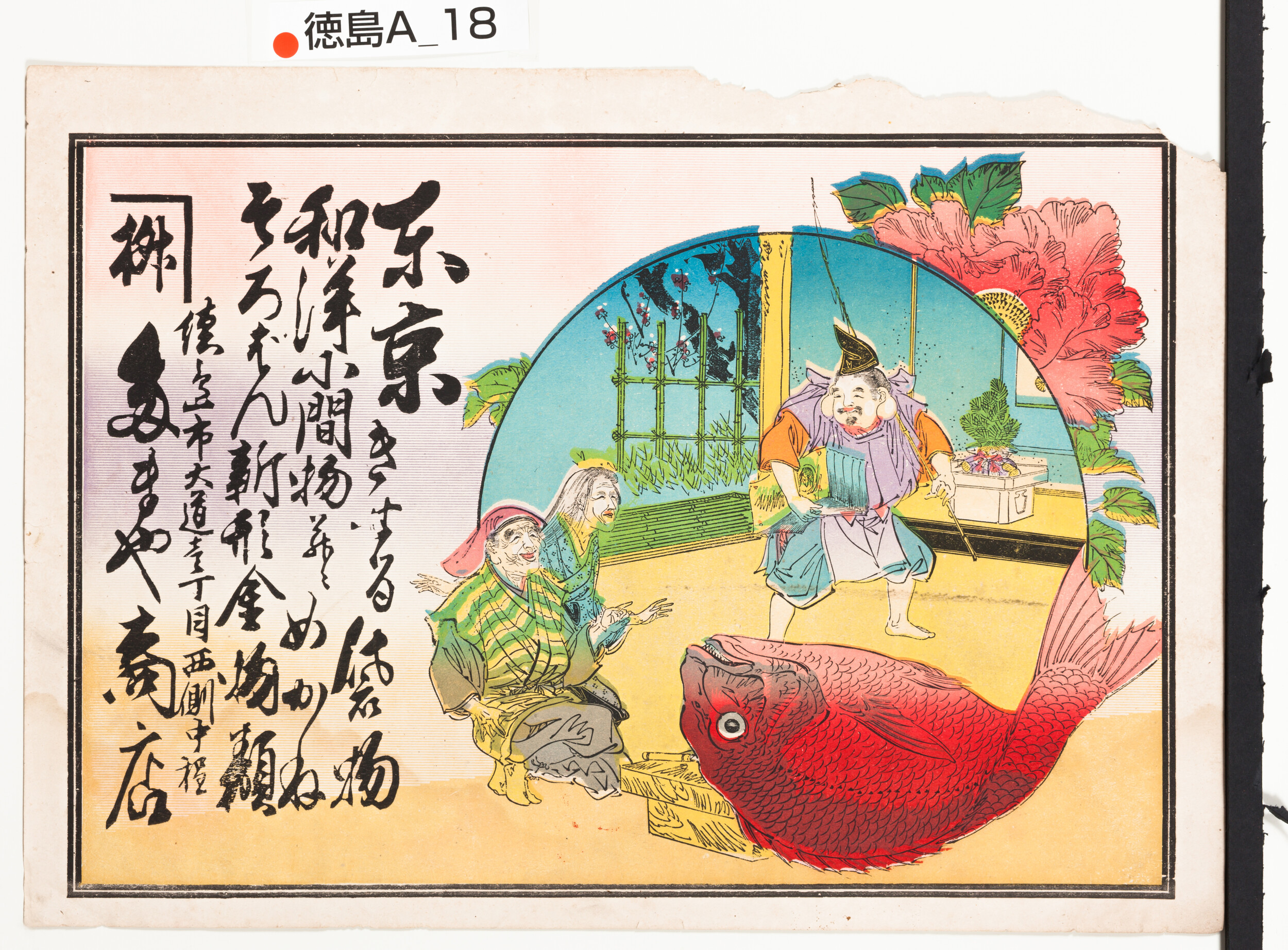 引札絵柄:恵比寿が持参した大鯛に喜ぶ老夫婦 商店場所:徳島市大道1丁目西側中程 商店名称:たまや商店 商売内容:東京きせる袋物 和洋小間物并ニめがねそろばん、新形金物類