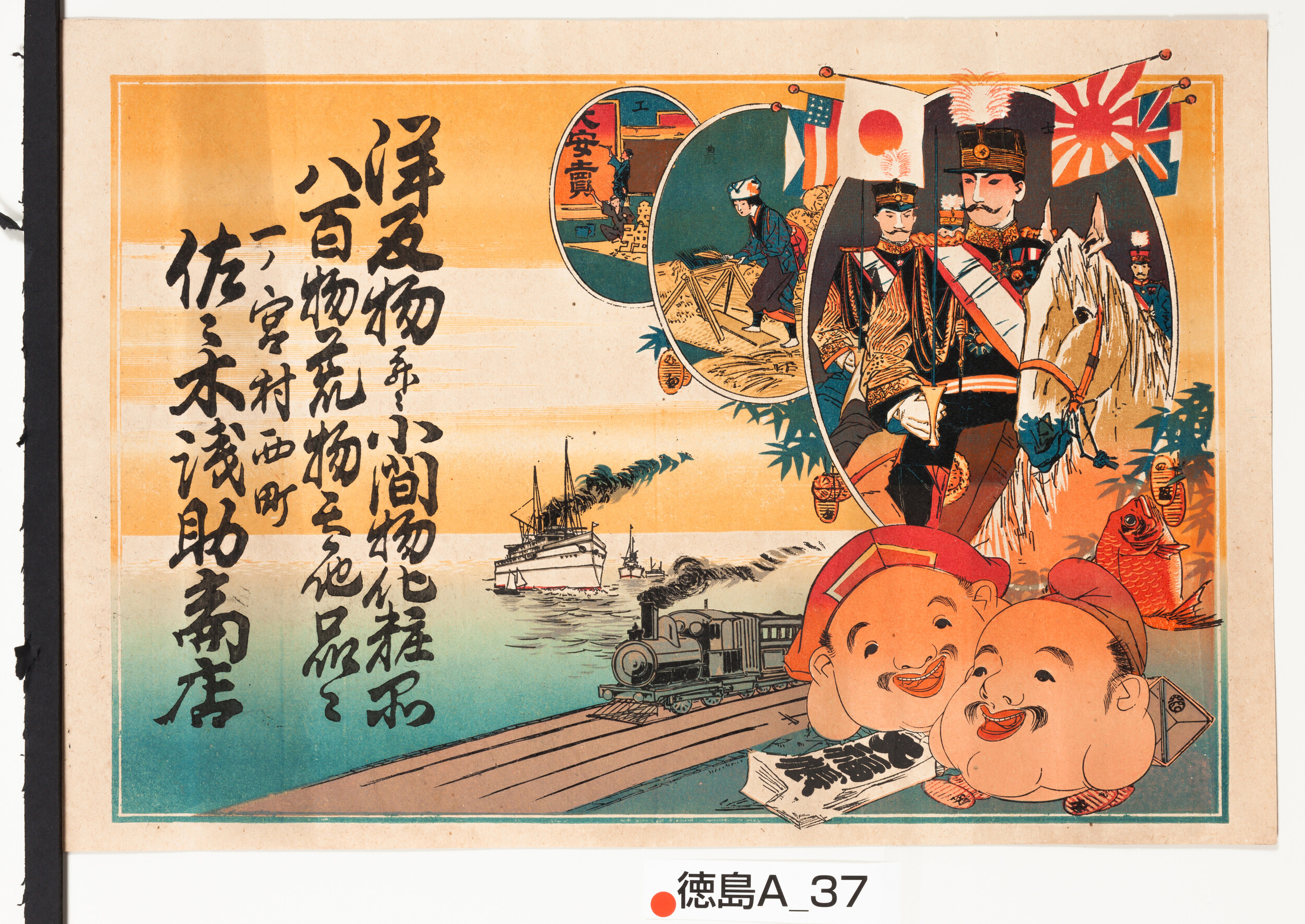 引札絵柄:馬に乗る2人の軍人、恵比須大黒、大福帳、蒸気船、蒸気機関車 商店場所:一ノ宮村西町 商店名称:佐々木浅助商店 商売内容:洋反物并ニ小間物化粧品八百物荒物其他品々