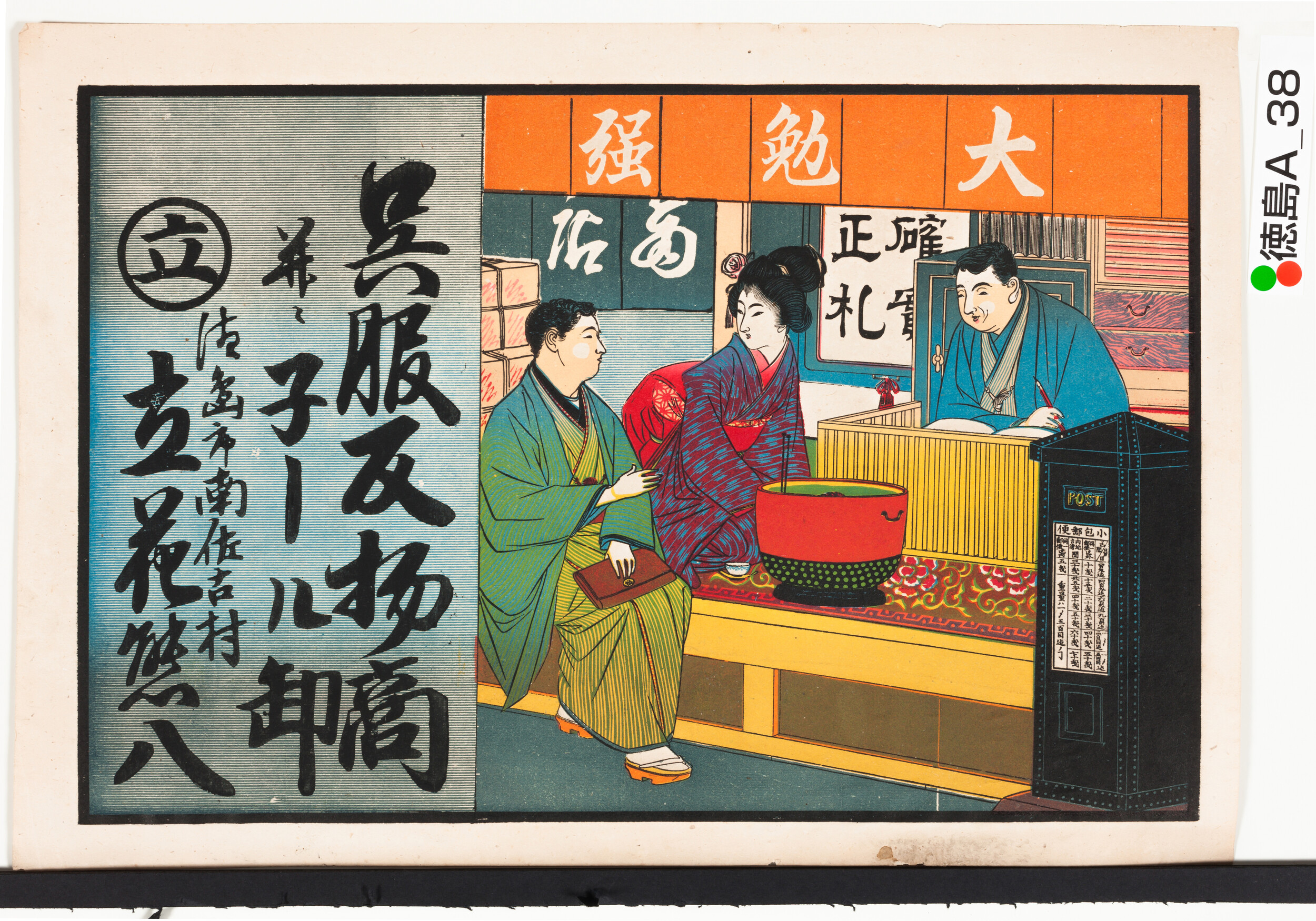 引札絵柄:大勉強ののれんが掛かる店先で商談をする人々、火鉢、黒のポスト 商店場所:徳島市南佐古村 商店名称:立花熊八 商売内容:呉服反物并ニ子ール(ネール)卸