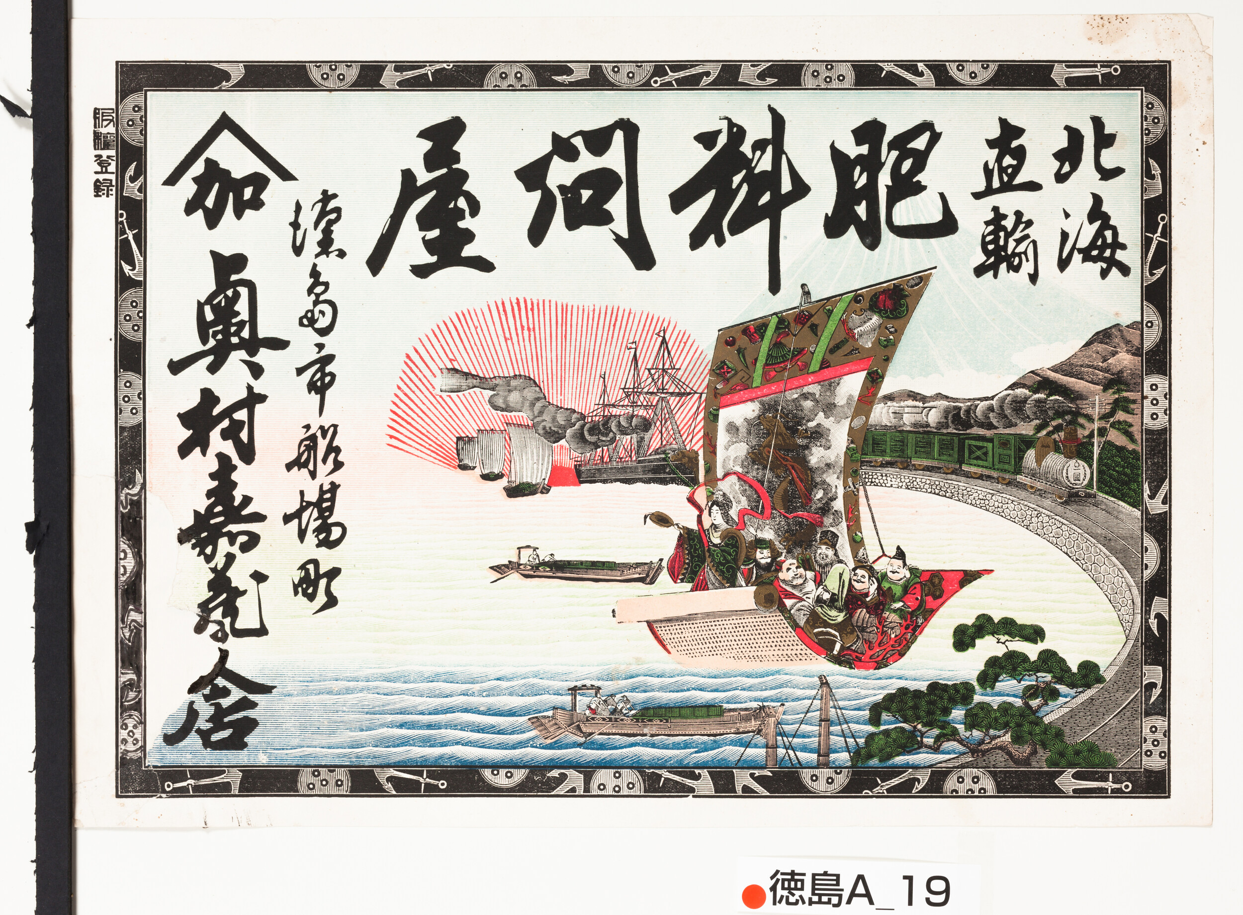 引札絵柄:七福神、蒸気機関車、蒸気船 商店場所:徳島市船場町 商店名称:越久村嘉蔵人店(か) 商売内容:肥料問屋