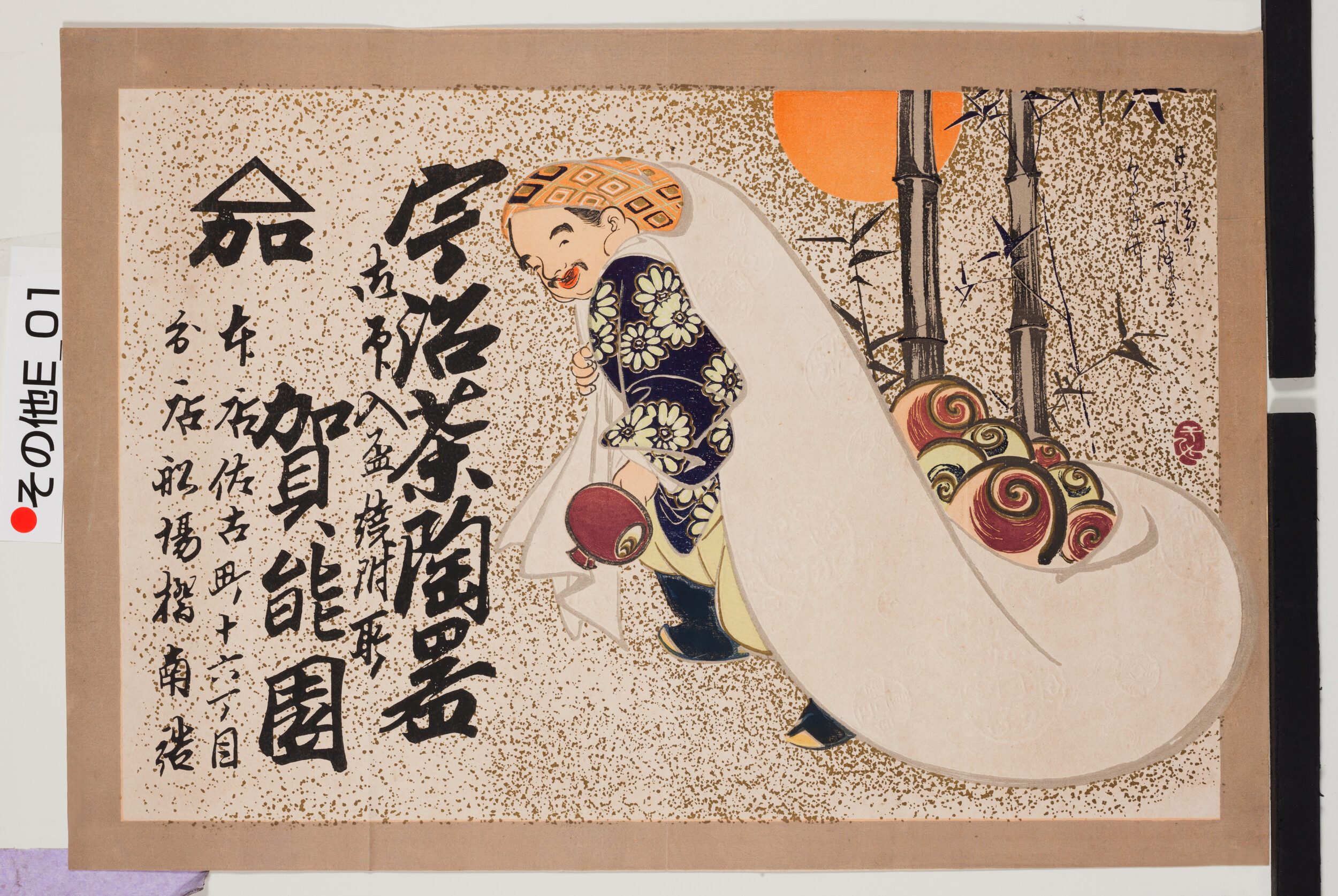 引札絵柄:打出の小槌を持つ大黒 商店場所:佐古町16丁目船場橋南詰 商店名称:賀能園 商売内容:宇治茶陶器 御印入盃焼附所