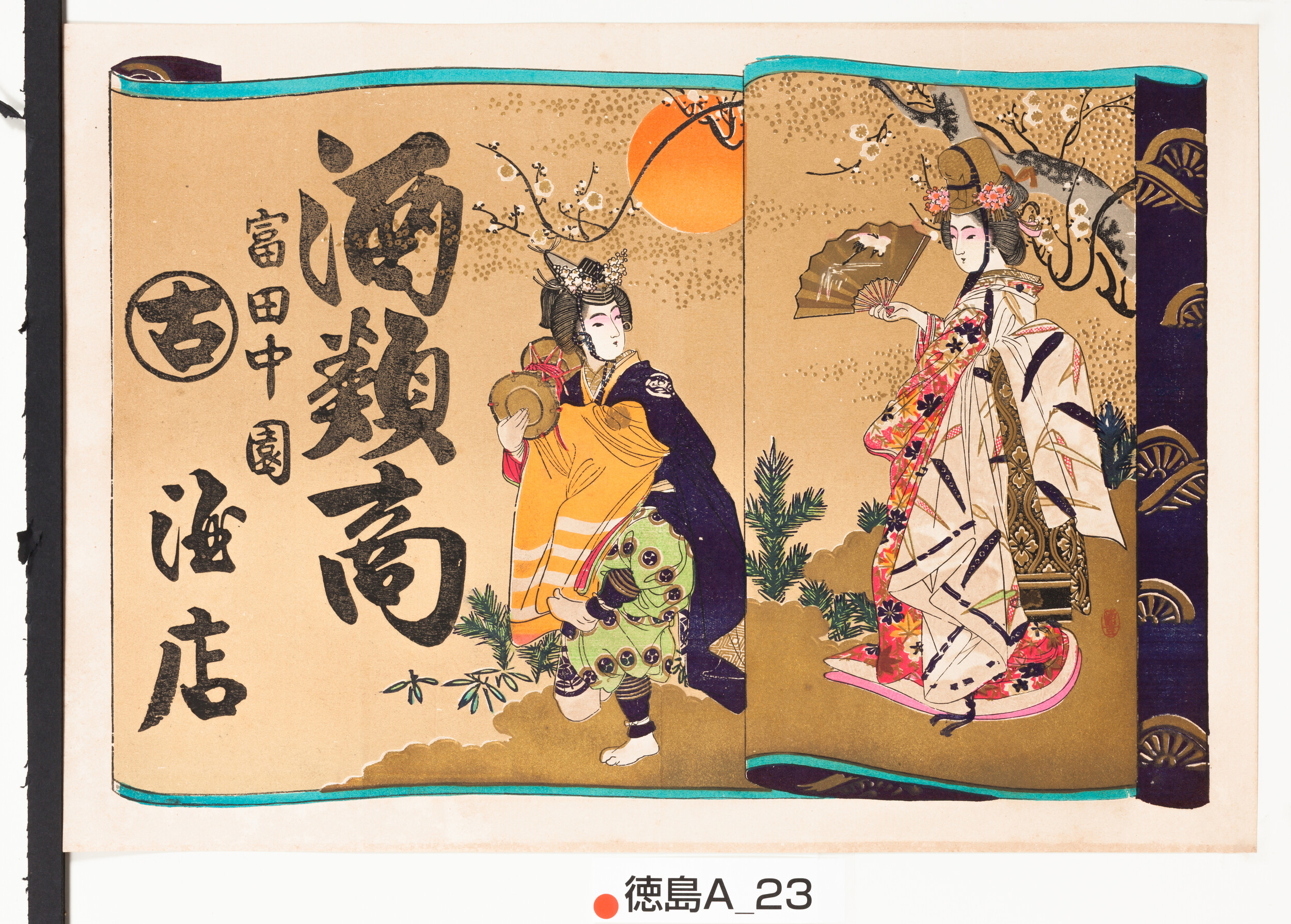 引札絵柄:鼓や扇を持つ女人 商店場所:富田中園 商店名称:屋号 ○に古 酒店 商売内容:酒類商