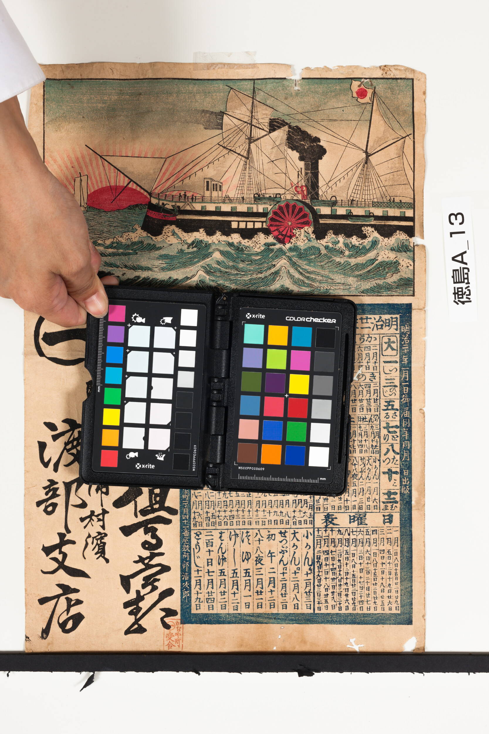 引札暦:蒸気船 明治21年略暦 商店場所:阿波津田浦村浜 商店名称:渡部支店 商売内容:荒物太物但馬苧類