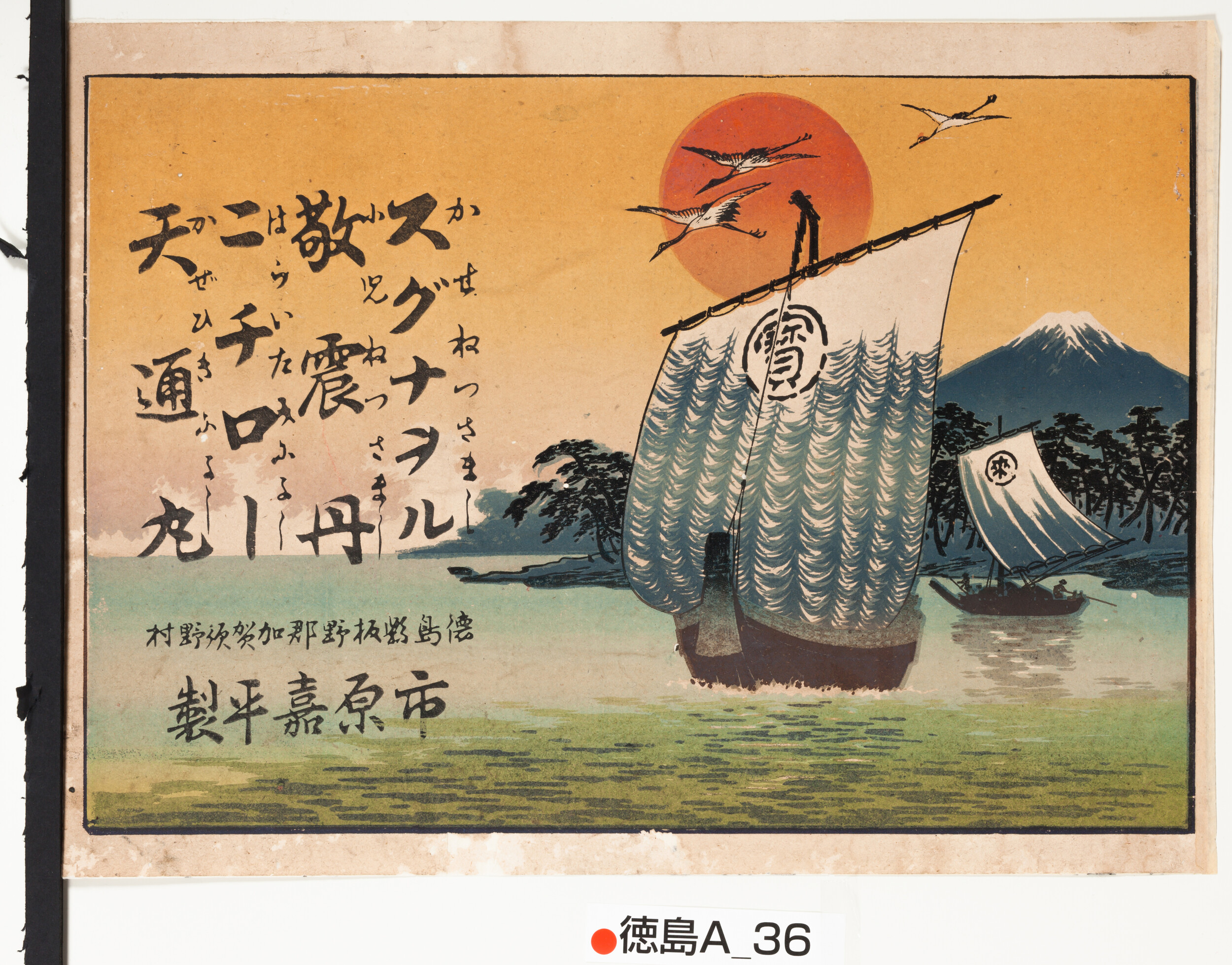 引札絵柄:朝日 鶴 帆掛け船 かぜねつさましスグナオル 小児ねつさまし敬震丹 はらいたによしニチロー かぜひきによし天通丸 商店場所:徳島県板野郡加賀須野村 商店名称:市原嘉平製 商売内容:薬