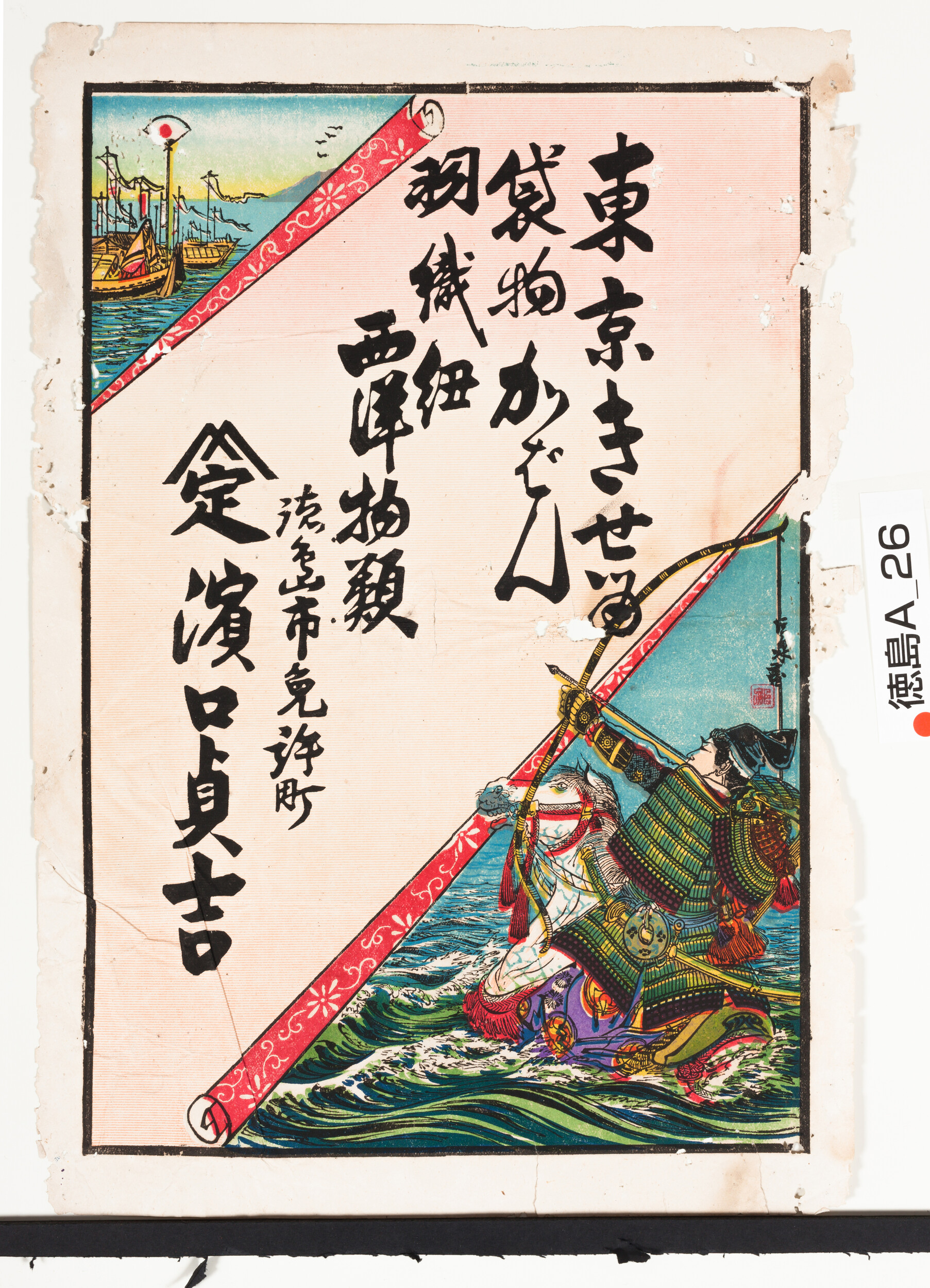 引札絵柄:那須与一扇の的 商店場所:徳島市免許町 商店名称:浜口貞吉 商売内容:東京きせる 袋物かばん 羽織紐 西洋物類