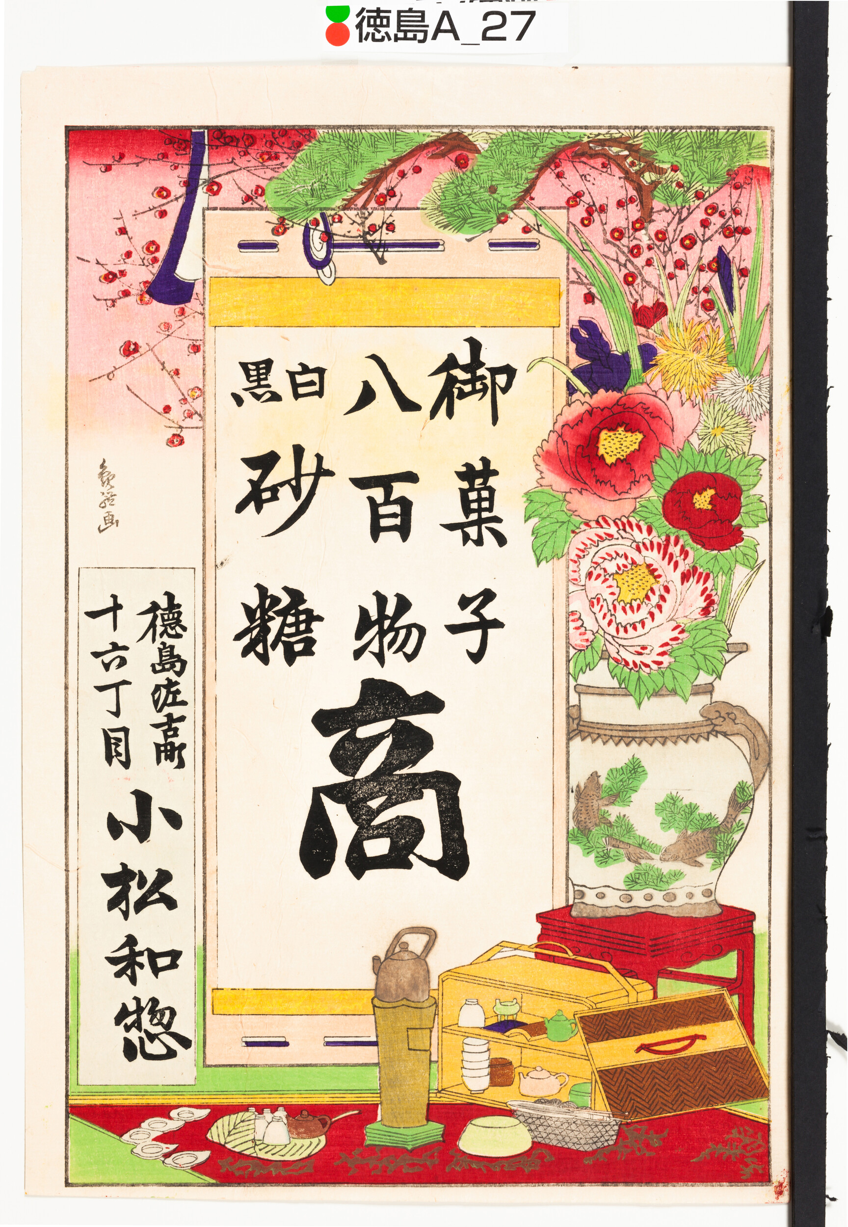 引札絵柄:掛け軸 壺に花 茶道具など 商店場所:徳島佐古町16丁目 商店名称:小松和惣 商売内容:御菓子 八百物 白黒砂糖商