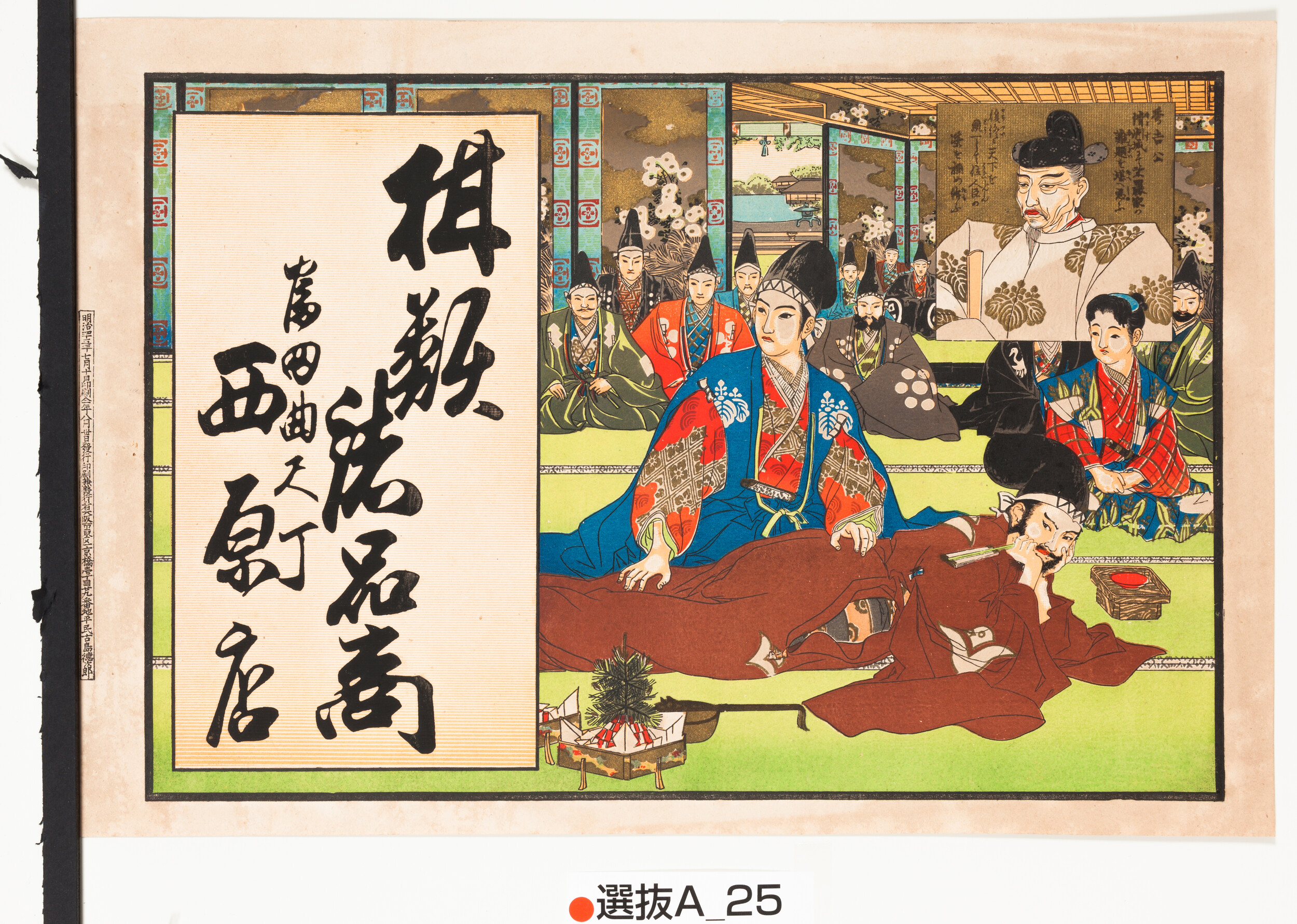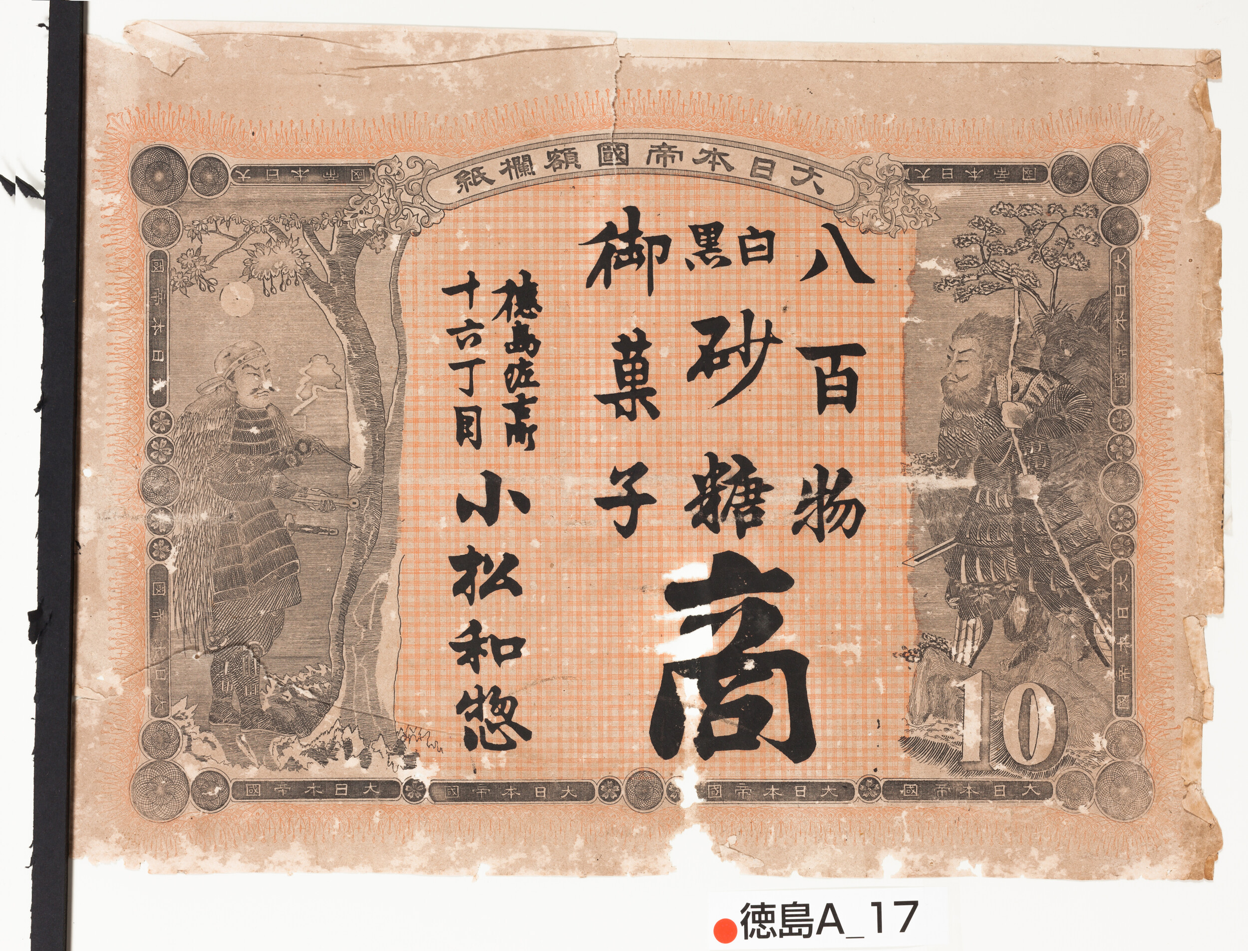 引札絵柄:太平記 桜の詩 大日本帝国額欄紙 商店場所:徳島佐古町16丁目 商店名称:小松和惣 商売内容:御菓子 八百物 白黒砂糖商