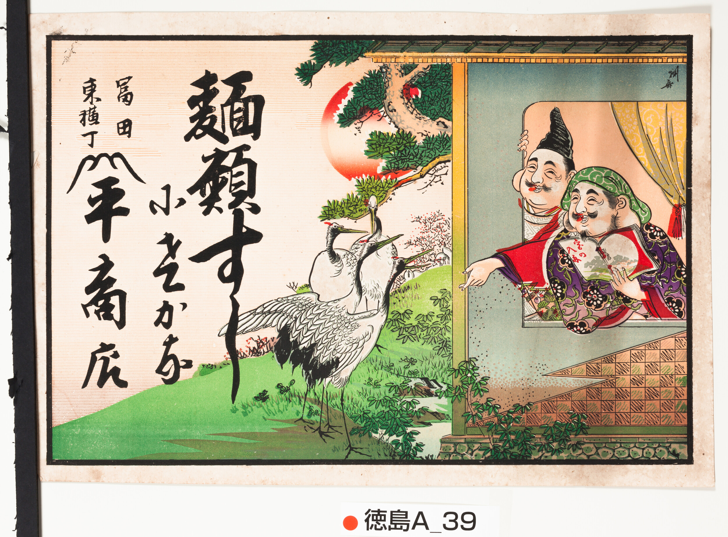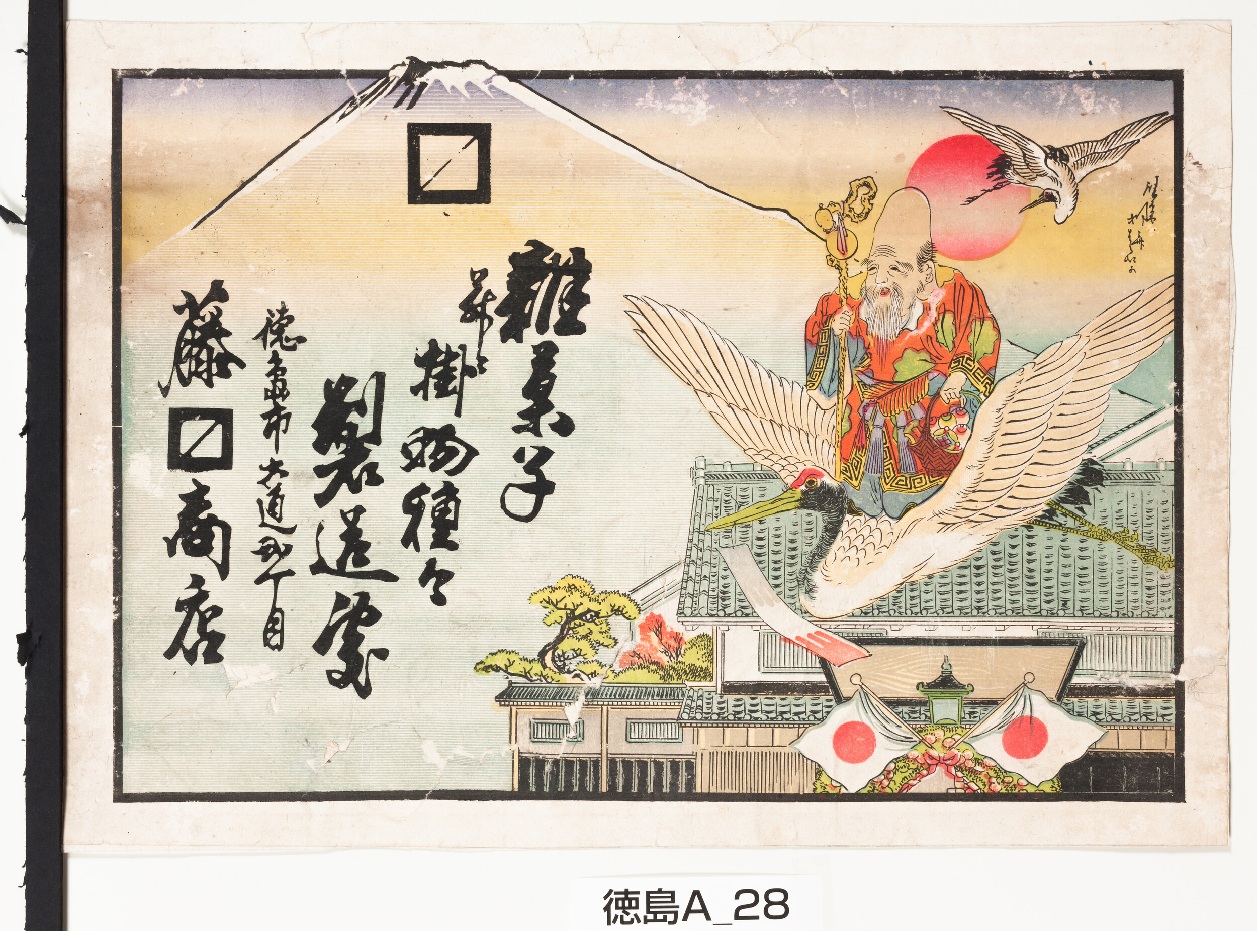 引札絵柄:鶴に乗った福禄寿 商店場所:徳島市大道2丁目 商店名称:藤(記号ますか)商店 商売内容:雑菓子并ニ掛物種々製造処