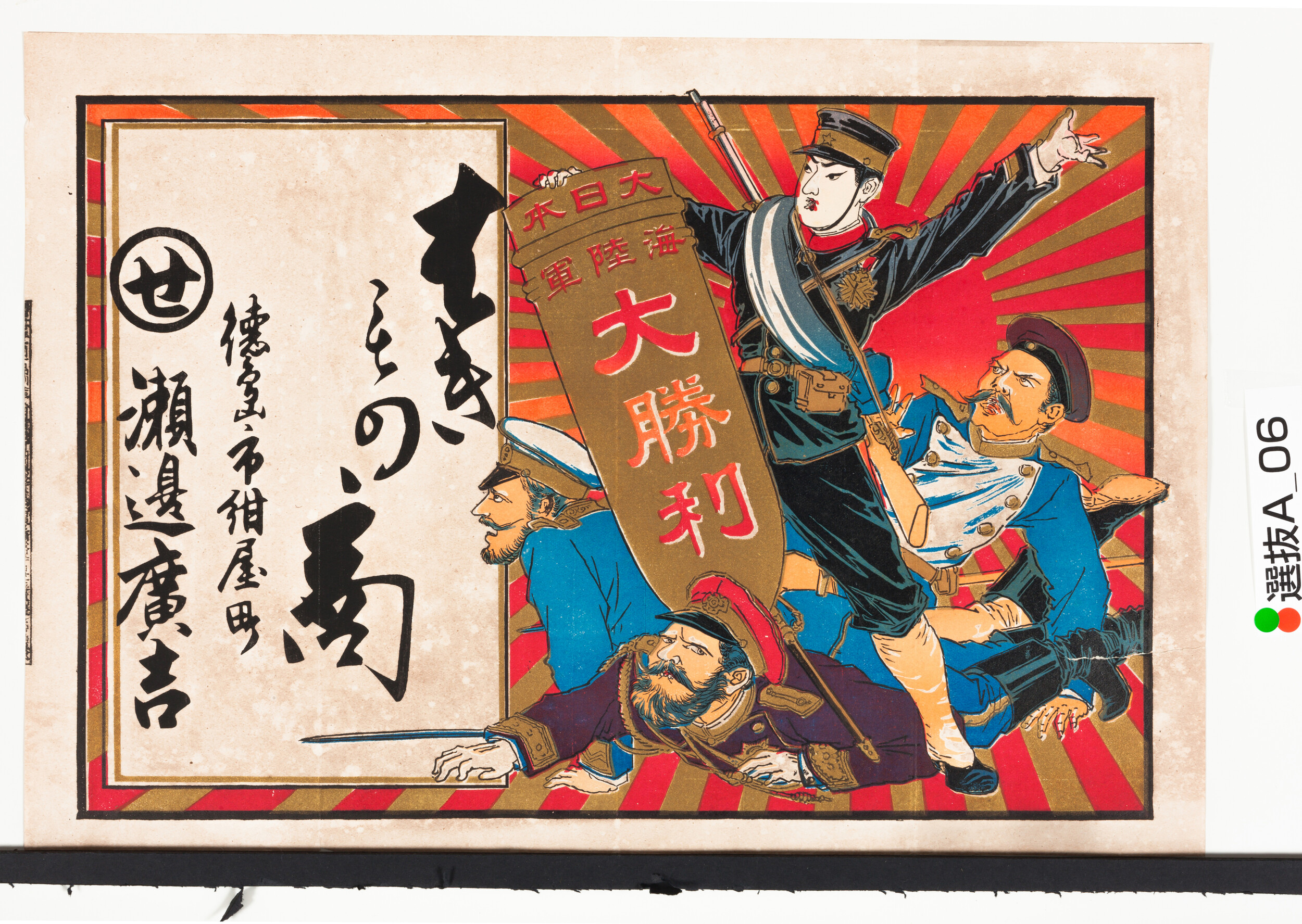 引札絵柄:大日本 海陸軍大勝利の旗を持つ兵士 商店場所:徳島市紺屋町 商店名称:瀬辺廣吉 商売内容:はきもの商