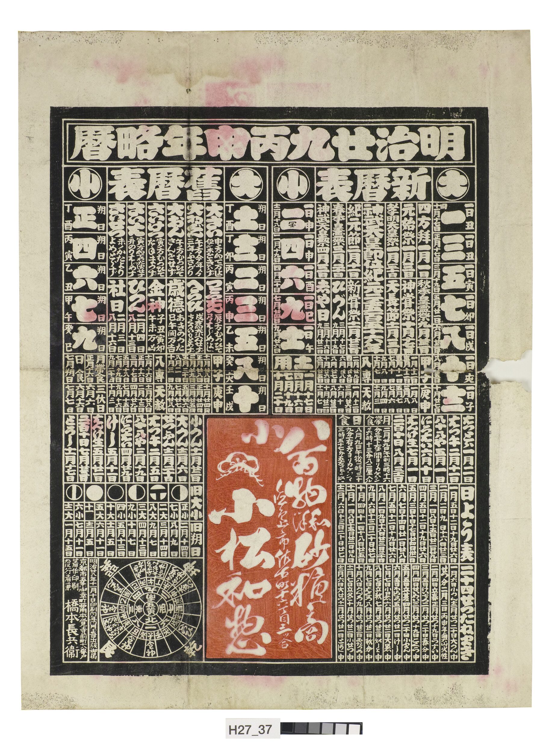 引札絵柄:明治29年丙申年略暦 商店場所:徳島市佐古町16丁目三ツ合 商店名称:小松和惣 商売内容:八百物和洋砂糖商