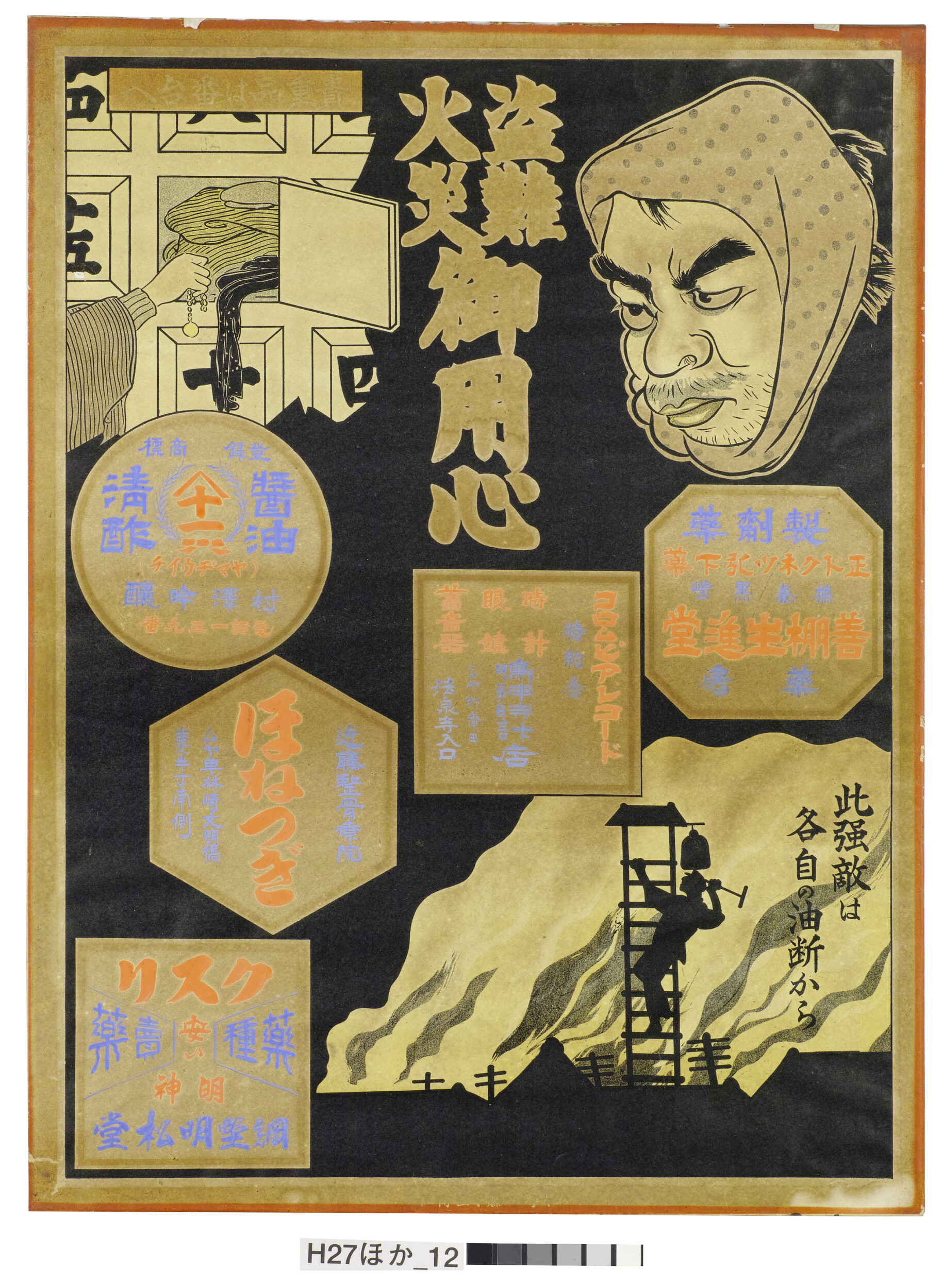 引札絵柄:盗難火災御用心 此強敵は各自の油断から 撫養黒崎 善棚生進堂 薬・ムヤ町斉田法泉寺入口 鳴神時計店 コロンビアレコード特約店 時計眼鏡蓄音器・村沢吟醸 醤油・近藤整骨両療院 ほねつぎ・綱野明松堂