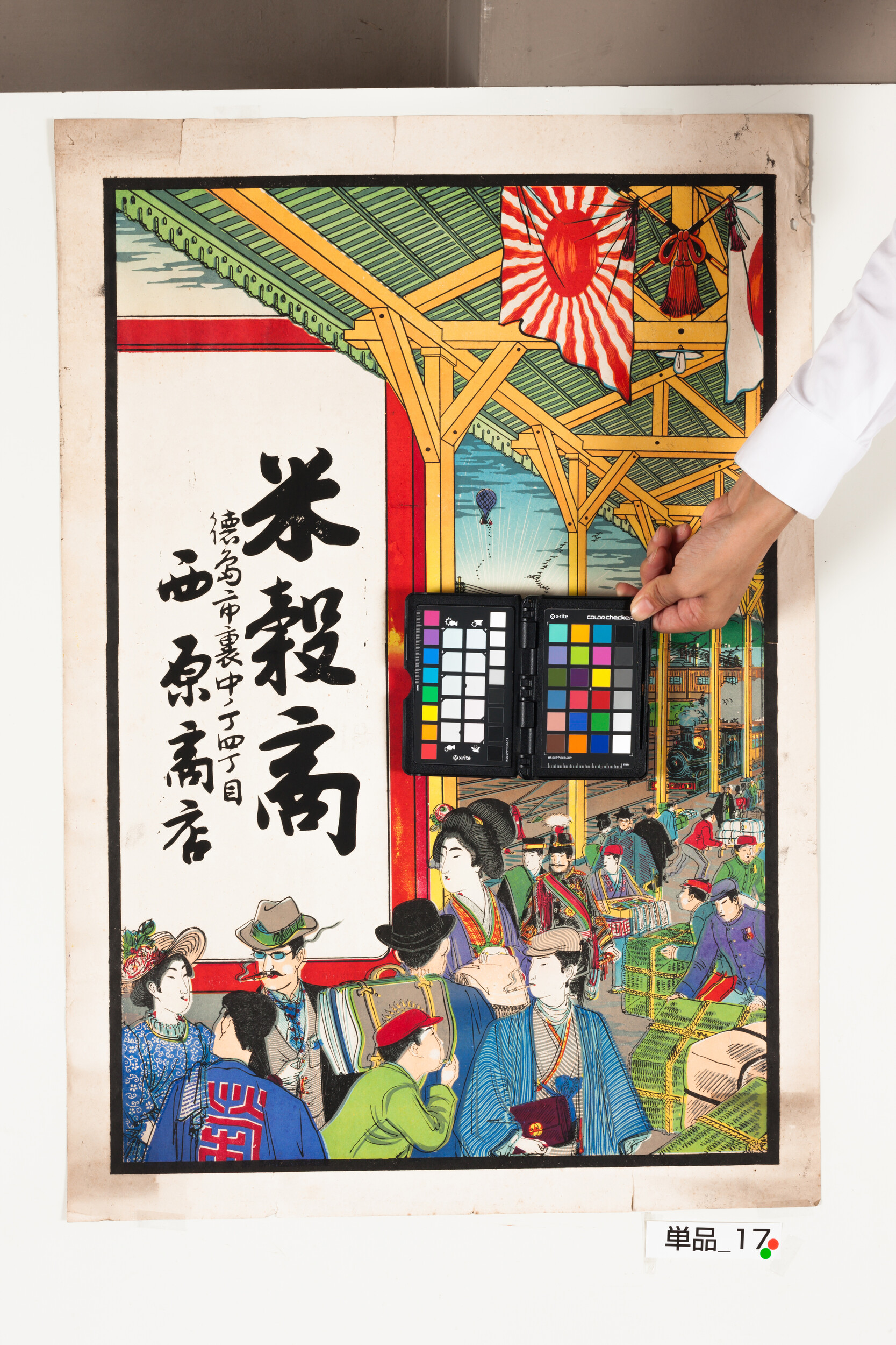 引札絵柄:秀吉の艱難辛苦 絵柄内「秀吉公清洲城にて柴田勝家の難題を堪へ忍ぶ 後終ニ位人臣の栄を極め給ふ」 商店場所:富田曲尺丁 商店名称:西原店 商売内容:柑類 諸品商