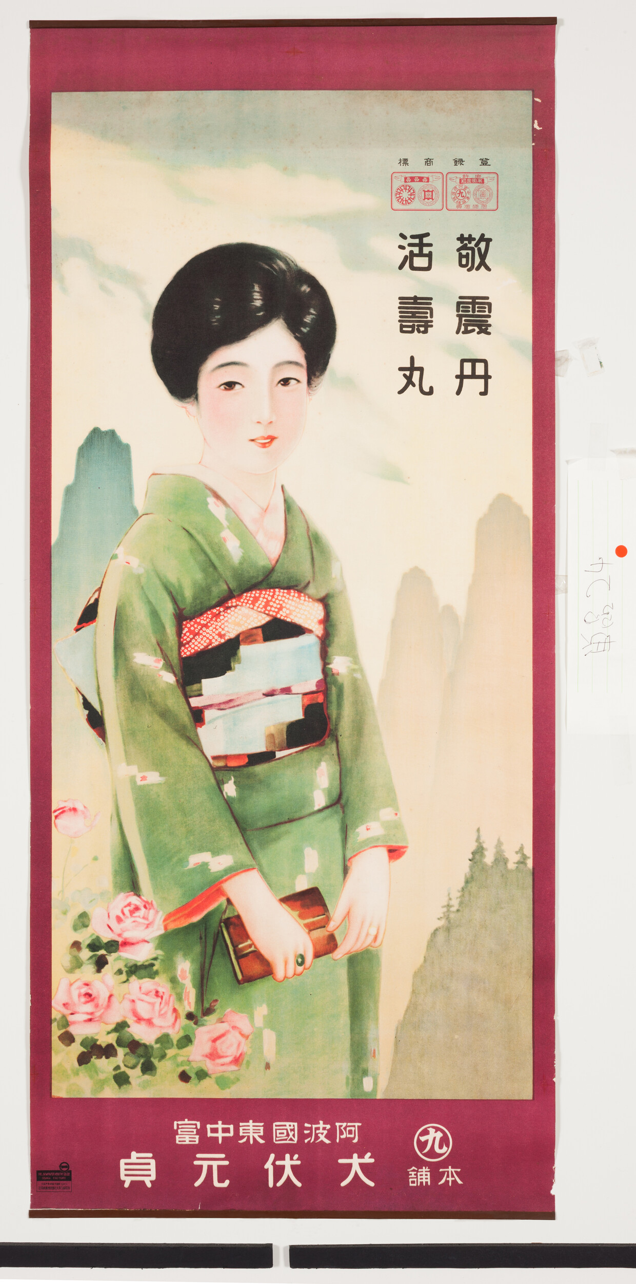 引札絵柄:クラッチバッグを手に持つ和服姿の女性 敬震丹・活寿丸 商店場所:阿波国東中富 商店名称:犬伏元貞 商売内容:薬