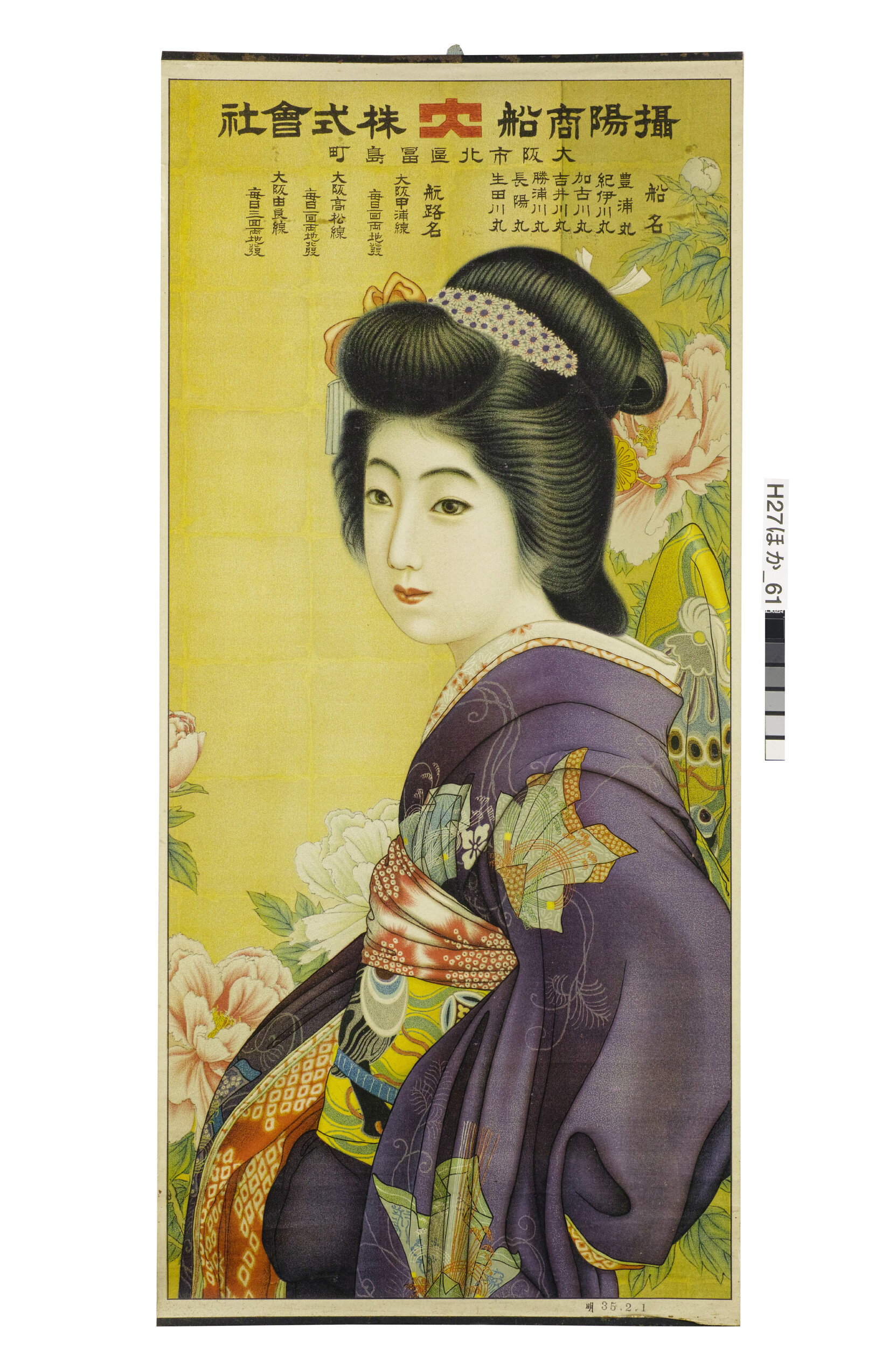 引札絵柄:船名名面 和服の女性 商店場所:大阪市北区富島町 商店名称:摂陽商船株式会社 商売内容:商船