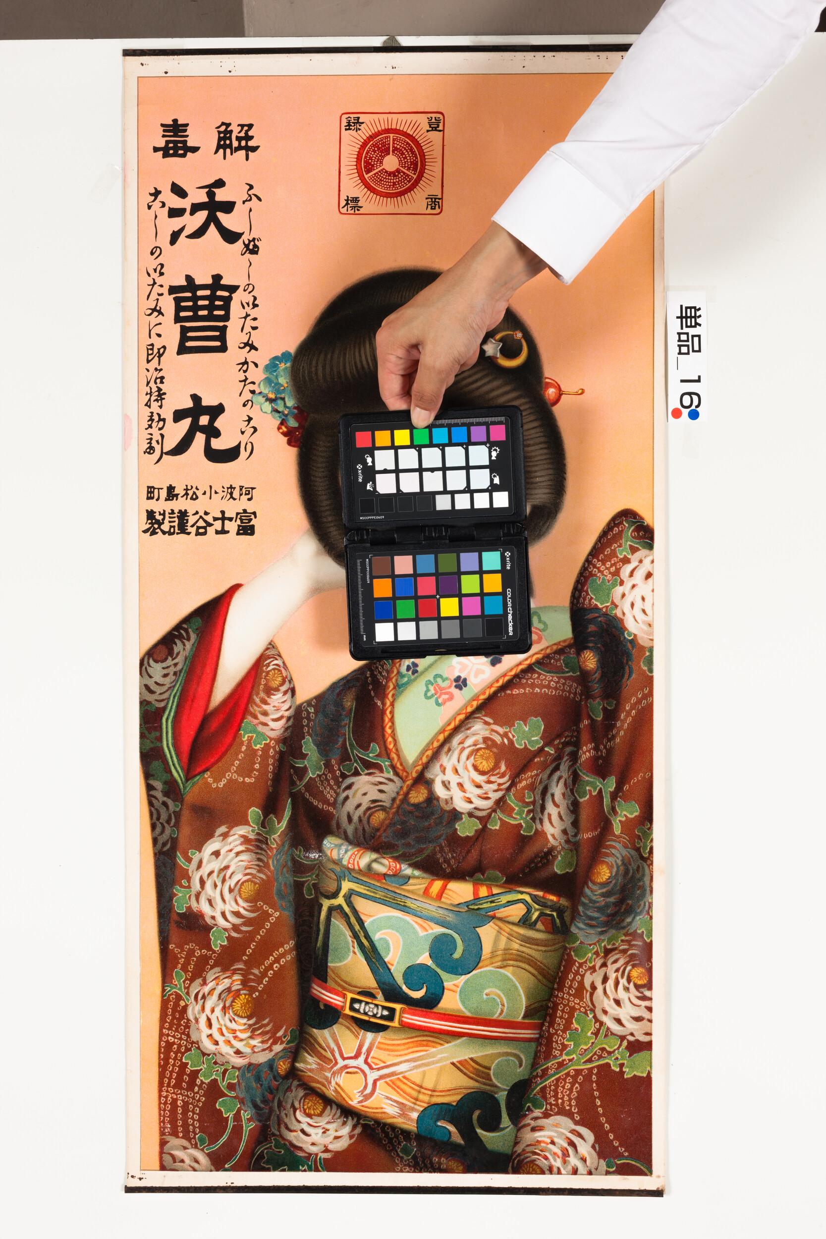 引札絵柄:髪に手をあてる女性 「解毒 沃曹丸」ふしぶしのいたみ、かたのこり、こしのいたみに即時特効剤 商店場所:阿波小松島町 商店名称:富士谷 商売内容:薬