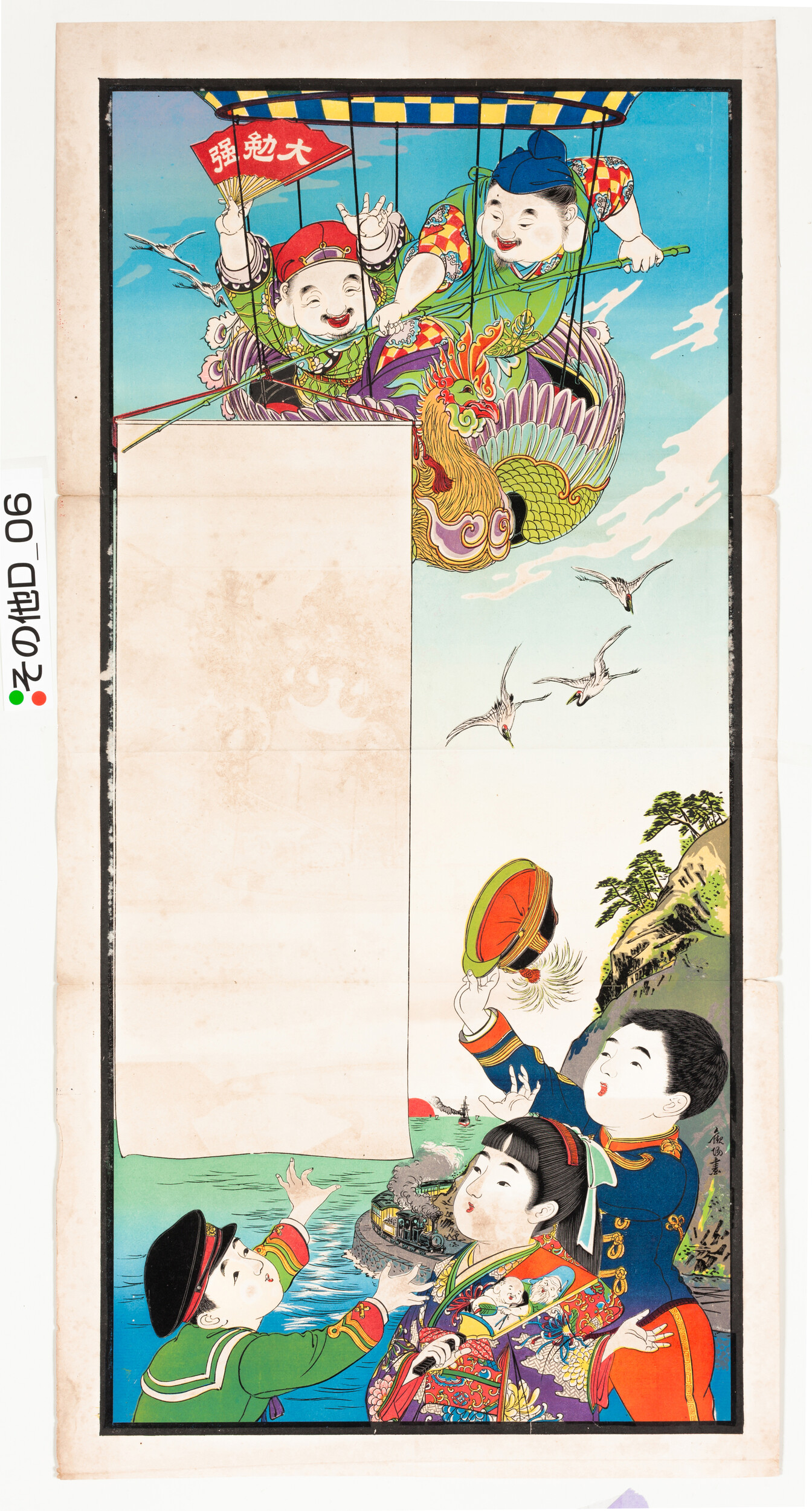 引札(名入れ前)気球に乗った恵比須大黒に手を振る三人の子供達