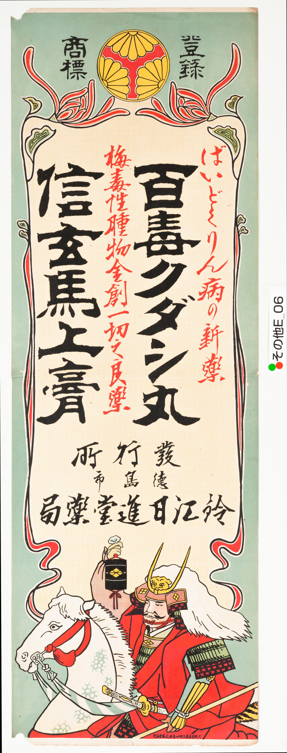 引札絵柄:馬上の武田信玄 「百毒クダシ丸 信玄馬上膏」 商店場所:徳島市 商店名称:鈴江日進堂薬局 商売内容:薬