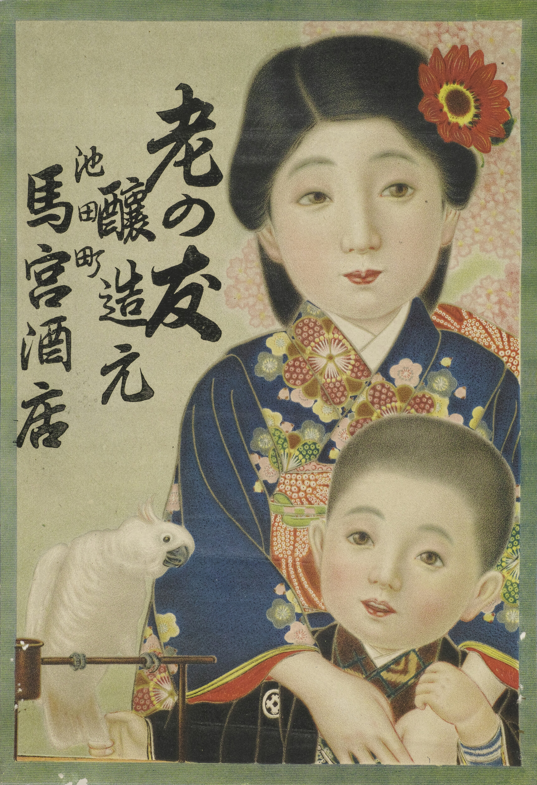 引札絵柄:着物を着た姉弟 左下にオウムの絵 商店場所:池田町 馬宮酒店(三芳菊) 商店名称:馬宮酒店 商売内容:老の友醸造元
