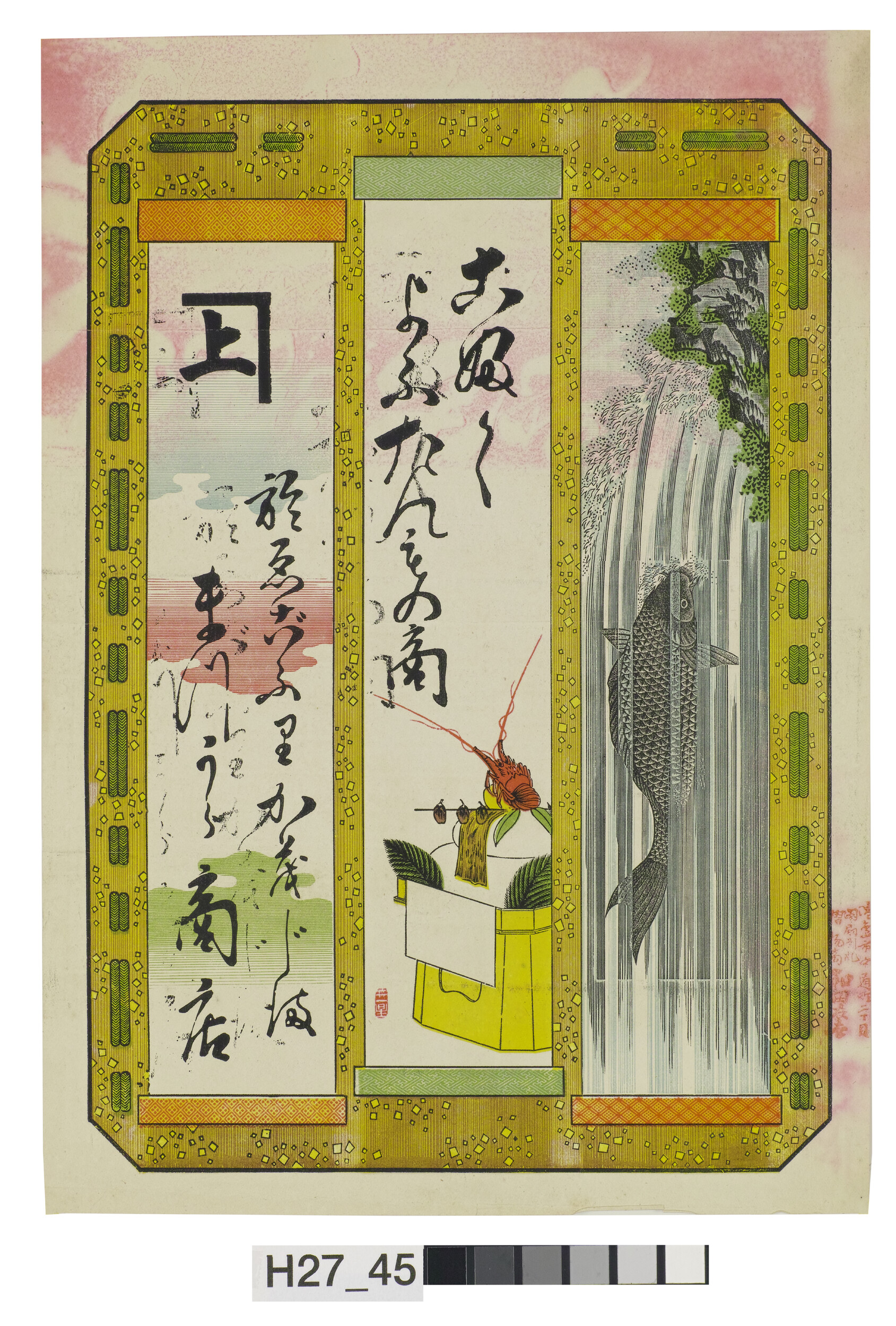 引札絵柄:短冊 右は鯉の滝登り 左は雲井 中央は正月飾り 商店場所:おえごおりかもじま 商店名称:まつうら商店 商売内容:呉服・洋反物商