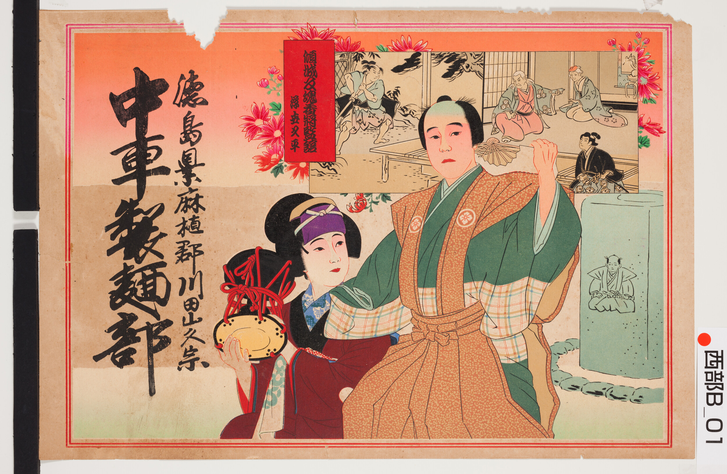 引札絵柄:傾城反魂香将監館 浮世又平 商店場所:徳島県麻植郡川田山久宗 商店名称:中車製麺部 商売内容:製麺