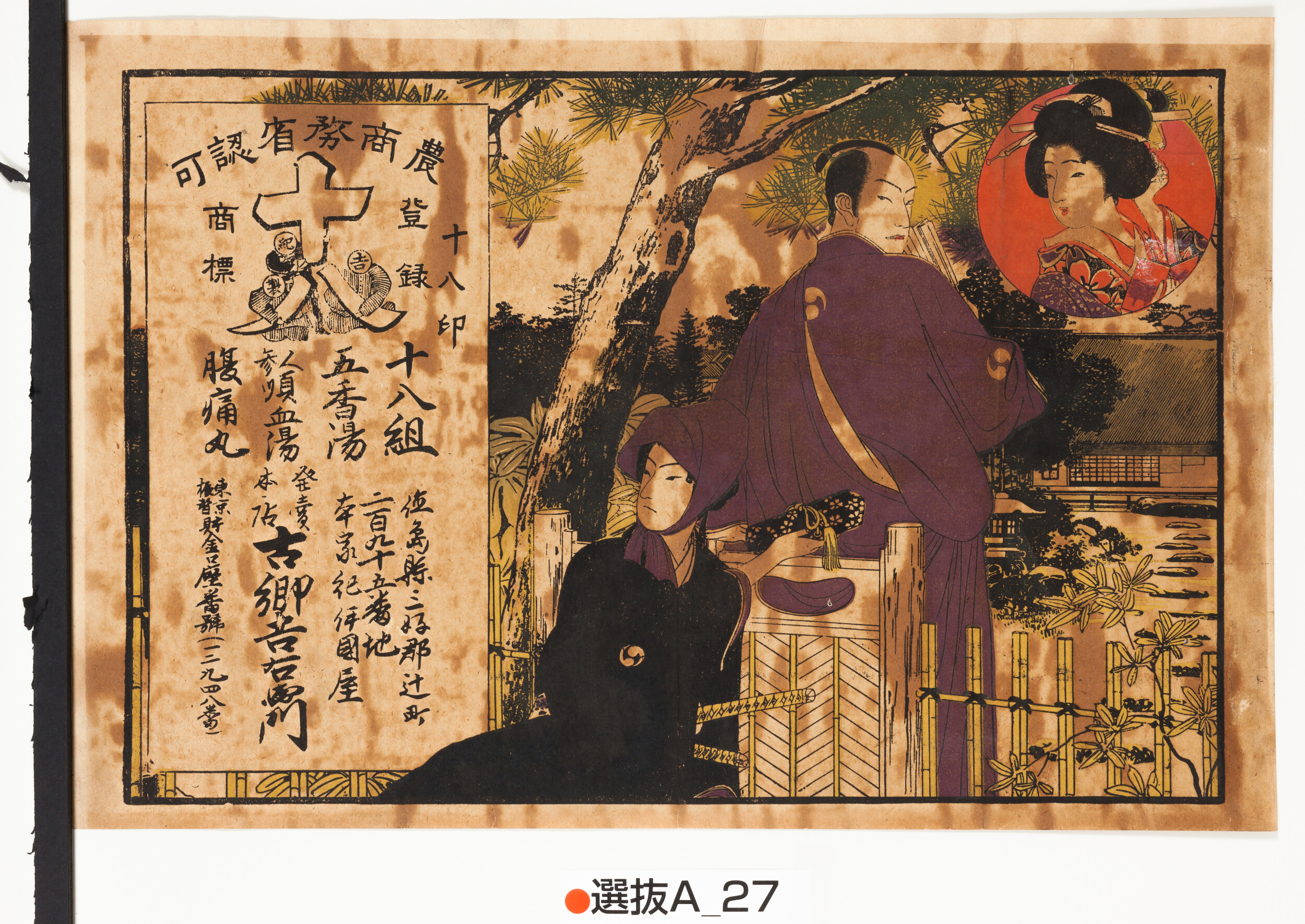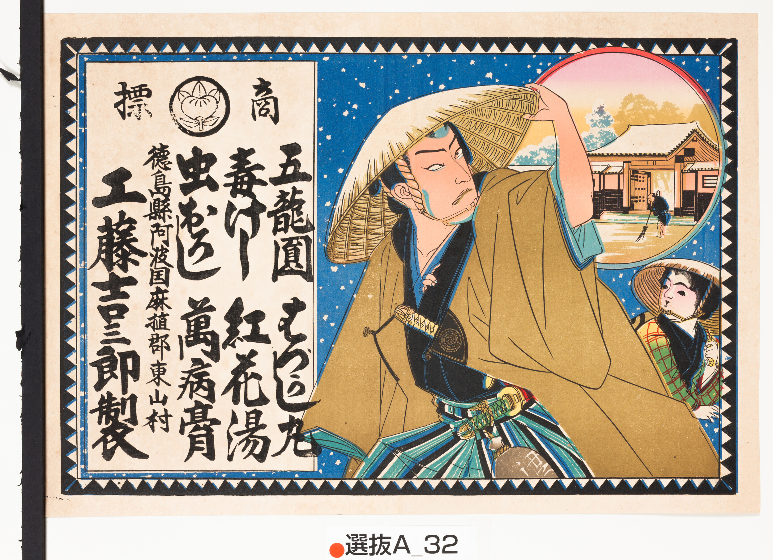 引札絵柄:大石内蔵之助・主税親子 商店場所:徳島県三好郡辻町295番地 商店名称:古郷吉右衛門 商売内容:薬
