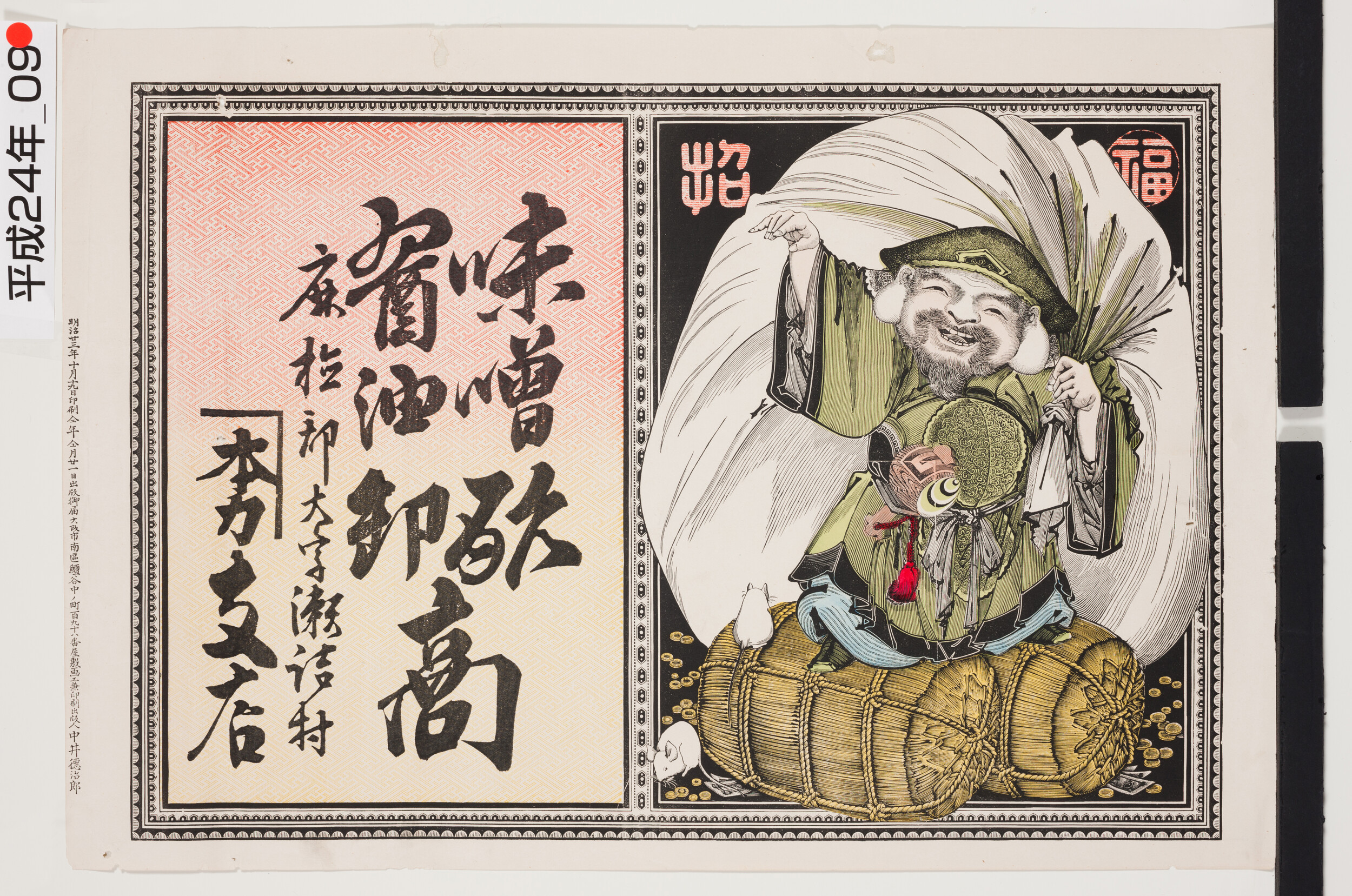 引札絵柄:招福 米俵の上に乗る大黒様 商店場所:麻植郡大字瀬詰村 商店名称:屋号(かねほんりき)支店か 商売内容:味噌 酢 醤油卸商