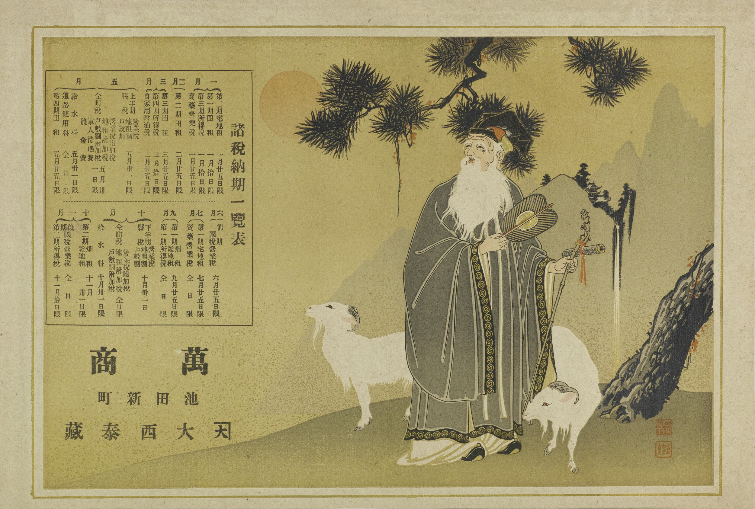 引札絵柄:松の下の寿老人と鹿か・諸税納期一覧表 商店場所:池田新町 商店名称:大西泰蔵 商売内容:萬商