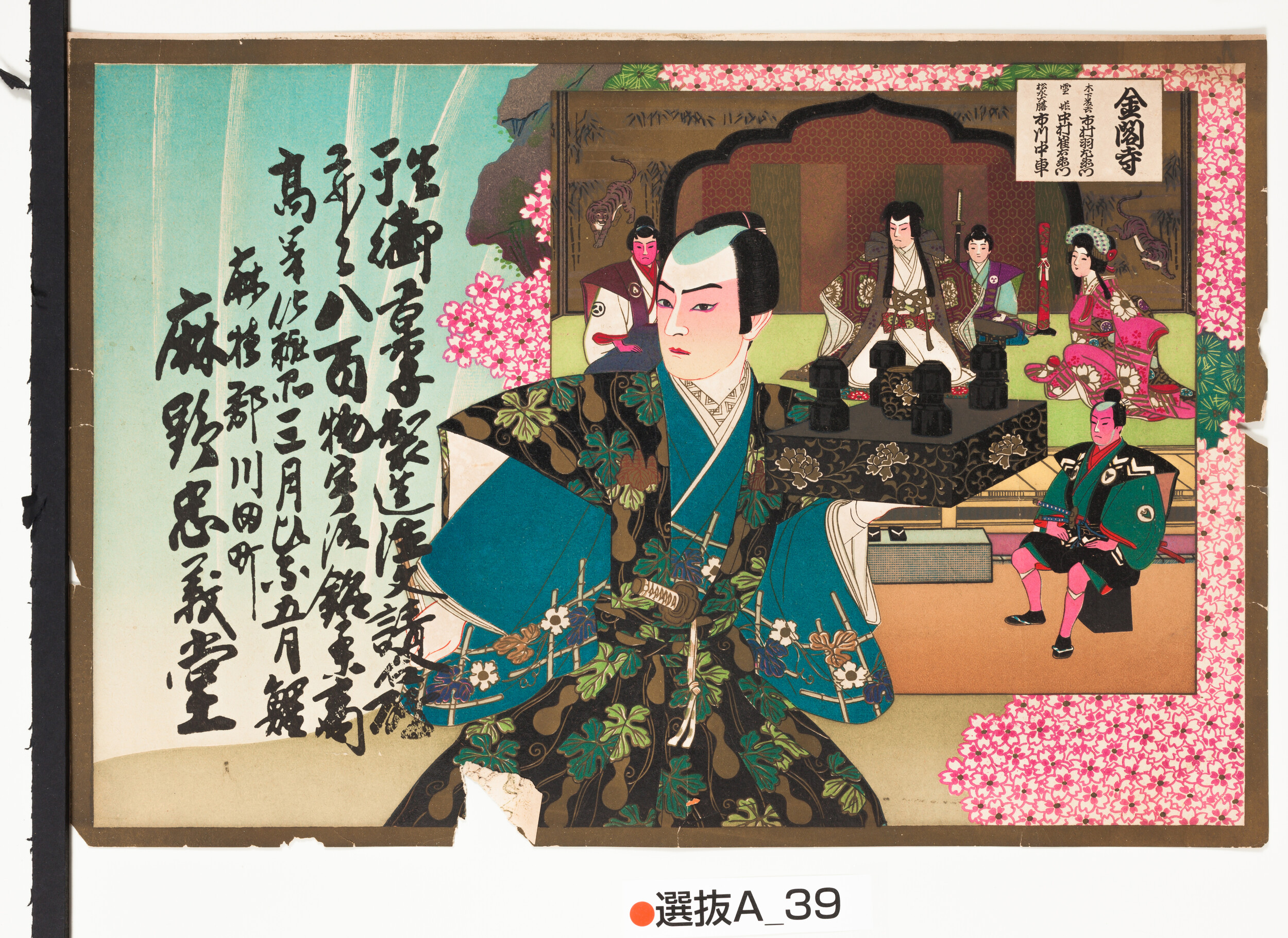 引札絵柄:歌舞伎 祇園祭礼信仰記 金閣寺の場面 商店場所:麻植郡川田町 商店名称:麻野忠義堂 商売内容:生干御菓子製造注文請合所并ニ八百物宇治銘茶商 高等化粧品 三月ひな 五月鯉