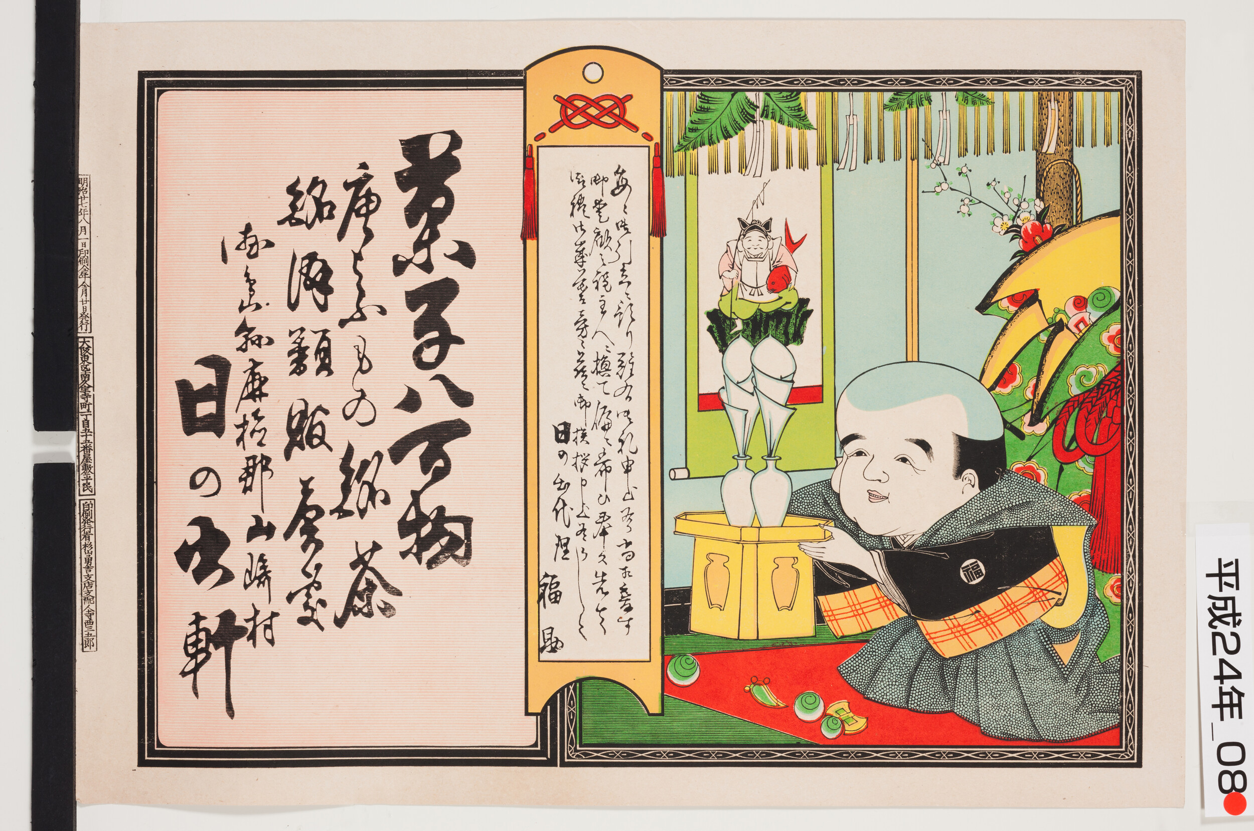 引札絵柄:福助 正月飾り付け 商店場所:徳島県麻植郡山崎村 商店名称:日の出軒 商売内容:菓子八百物唐洋物銘茶銘酒類販売処