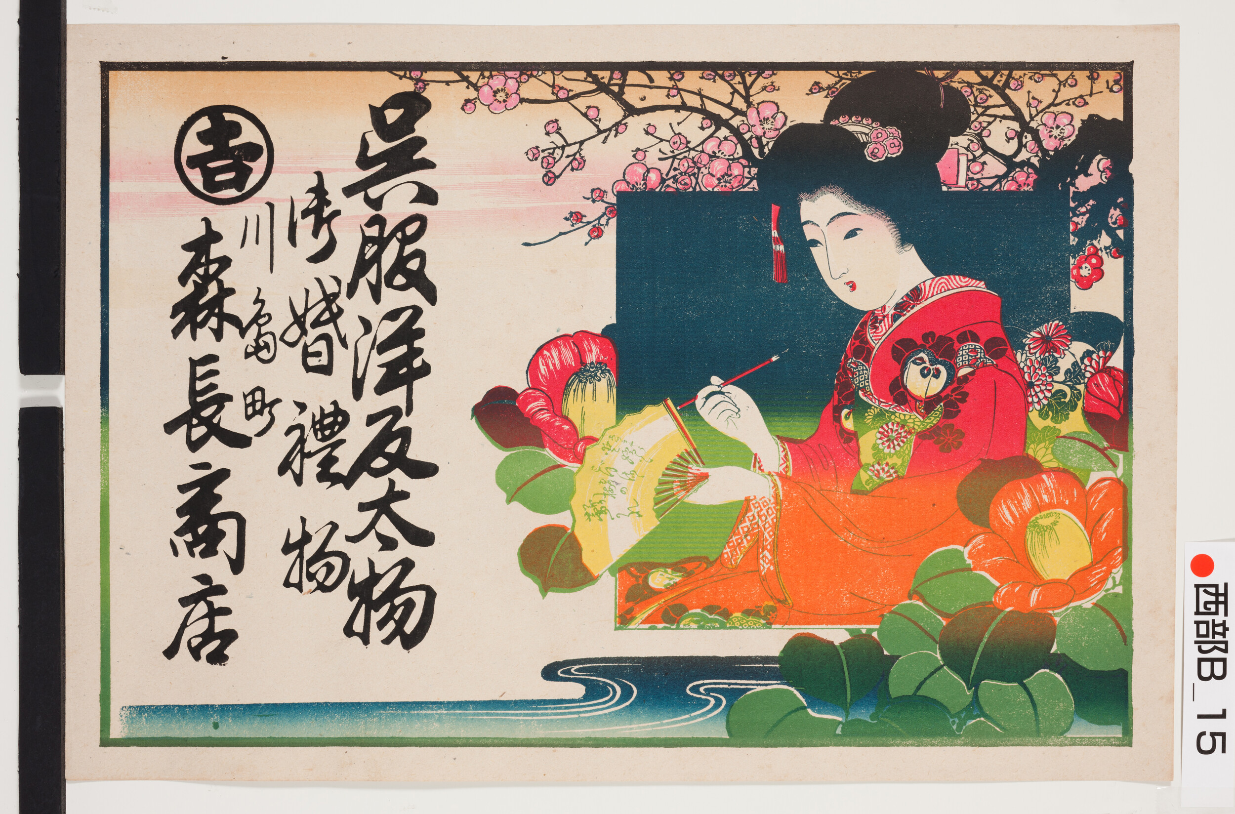引札絵柄:扇子と筆を持つ美人図(背景に紅梅) 商店場所:川島町 商店名称:森長商店 商売内容:呉服洋反太物御婚礼物
