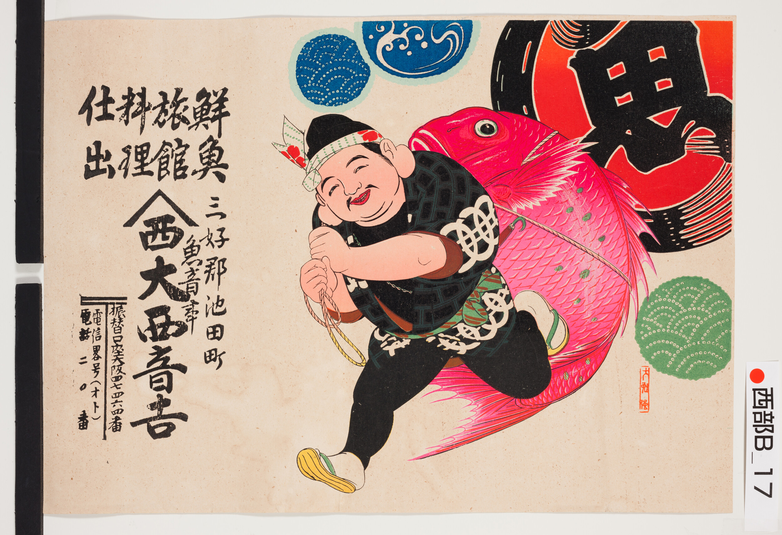 引札絵柄:鯛を担ぐ恵比寿 商店場所:三好郡池田町 商店名称:魚音事 大西音吉 商売内容:鮮魚、旅館、料理、仕出