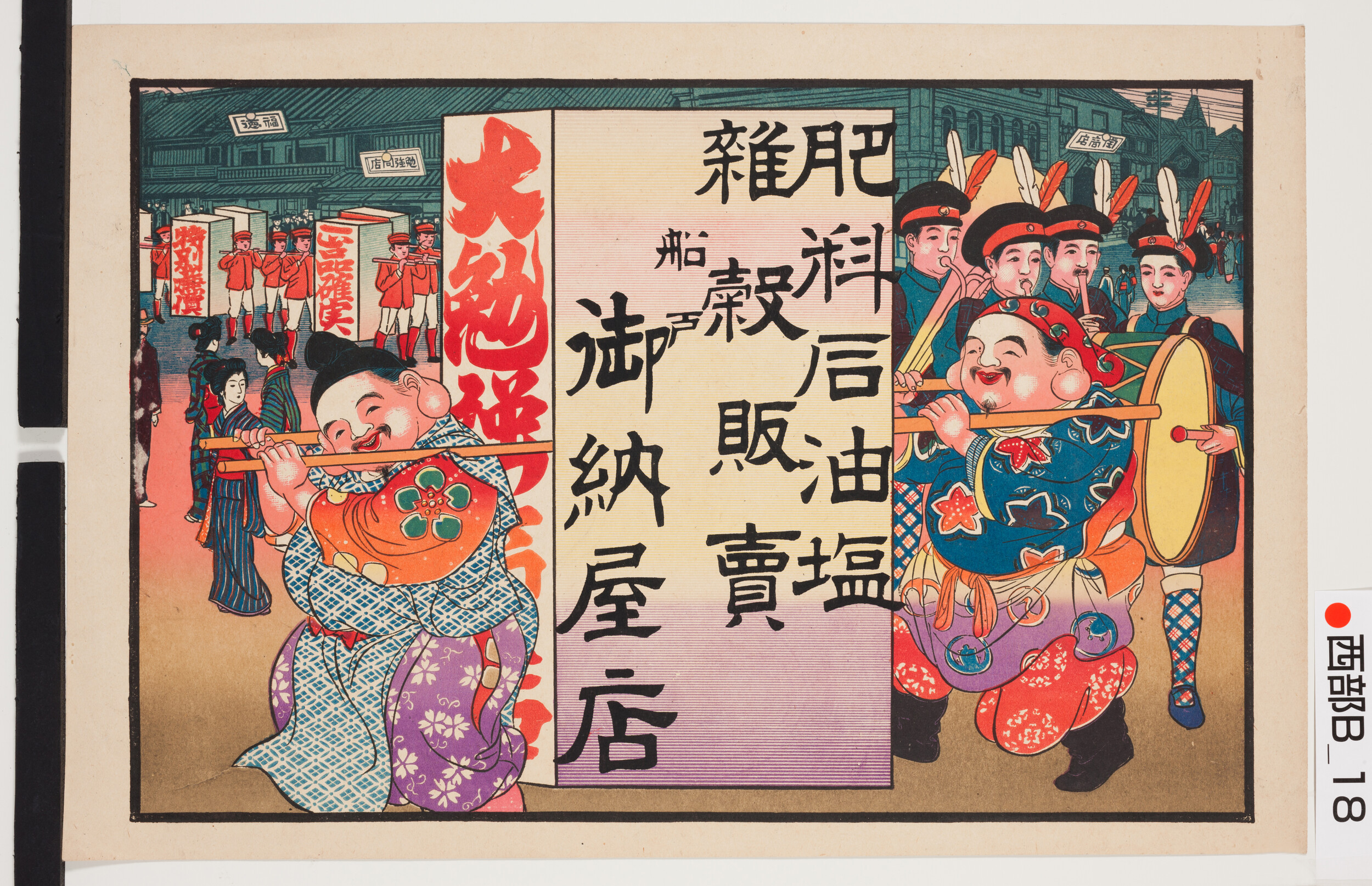 引札絵柄:ジンタ 看板を担ぐ恵比寿大黒 商店場所:船戸 商店名称:御納屋店 商売内容:肥料、石油、塩、雑穀販売