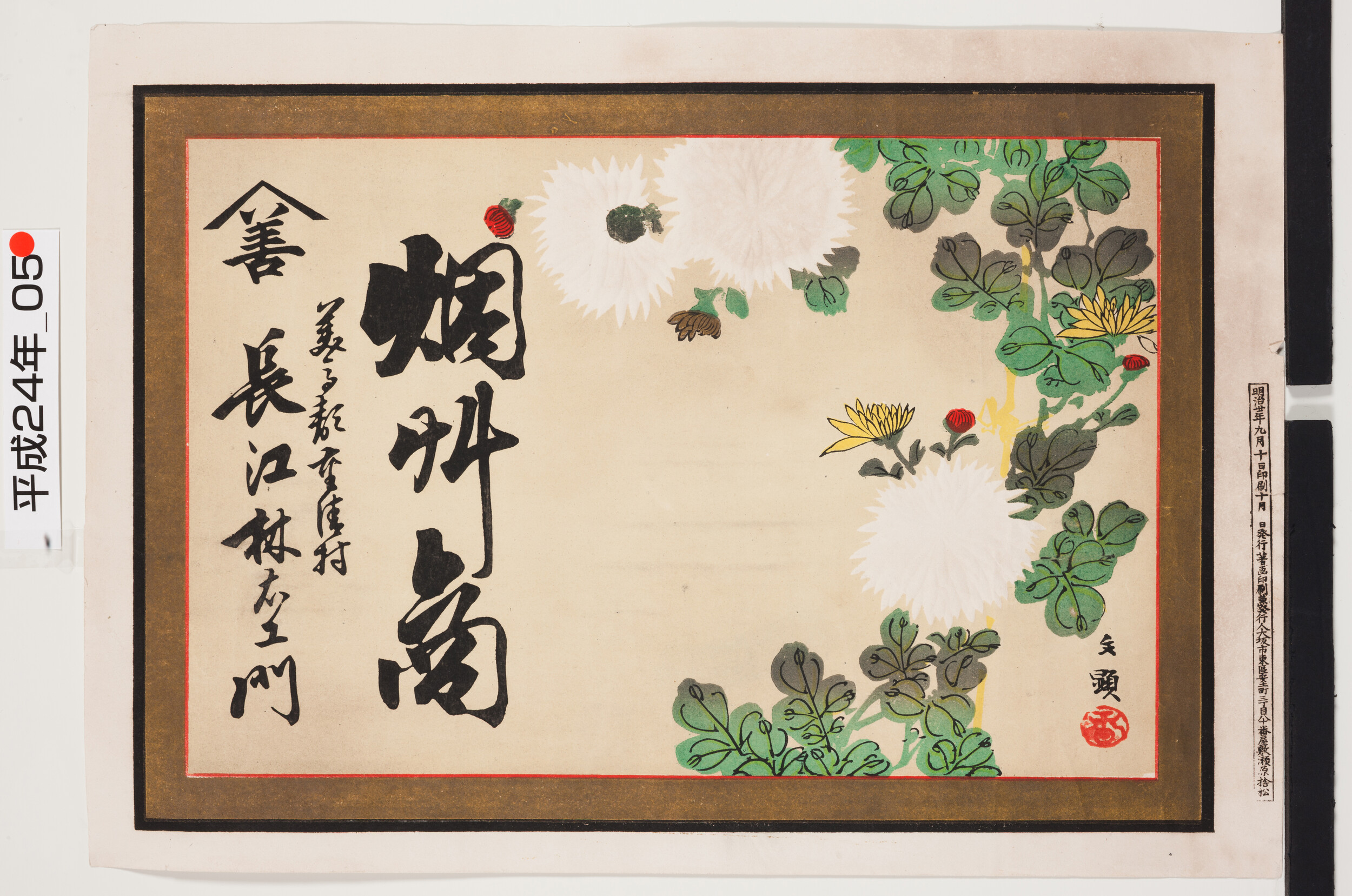 引札絵柄:菊の花 商店場所:美馬郡重清村 商店名称:長江林右衛門 商売内容:煙草商