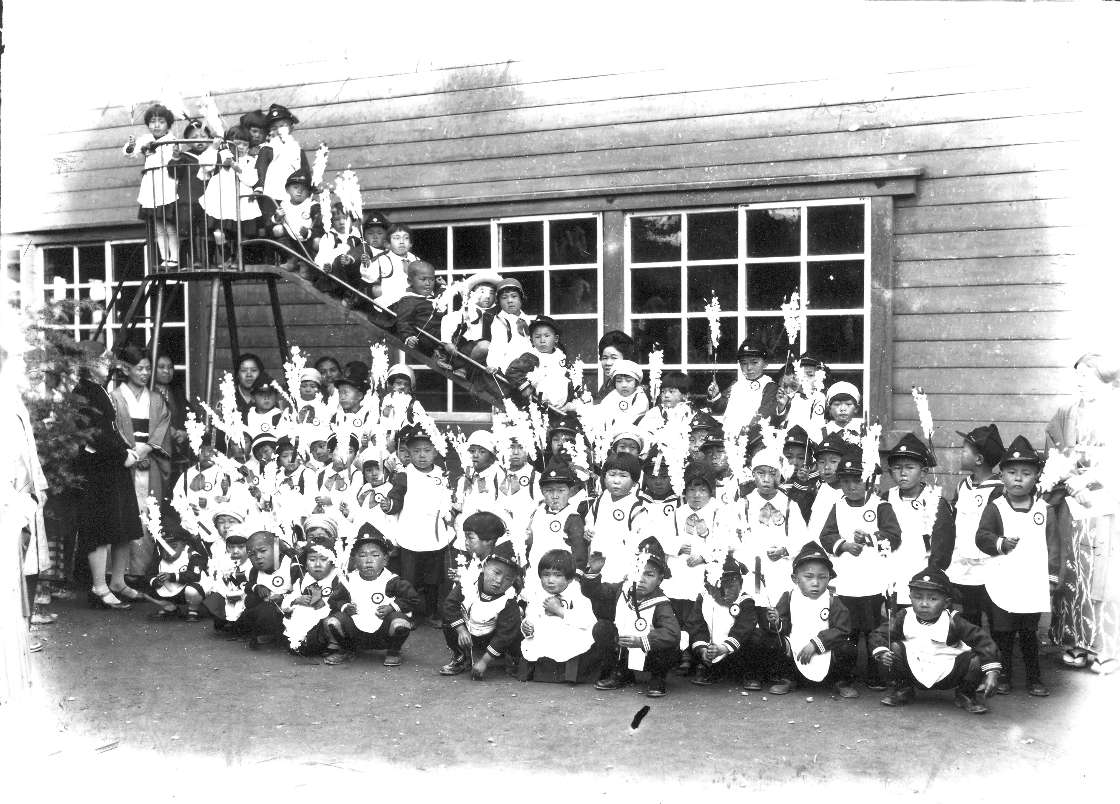 滑り台の上で記念写真 卒園式