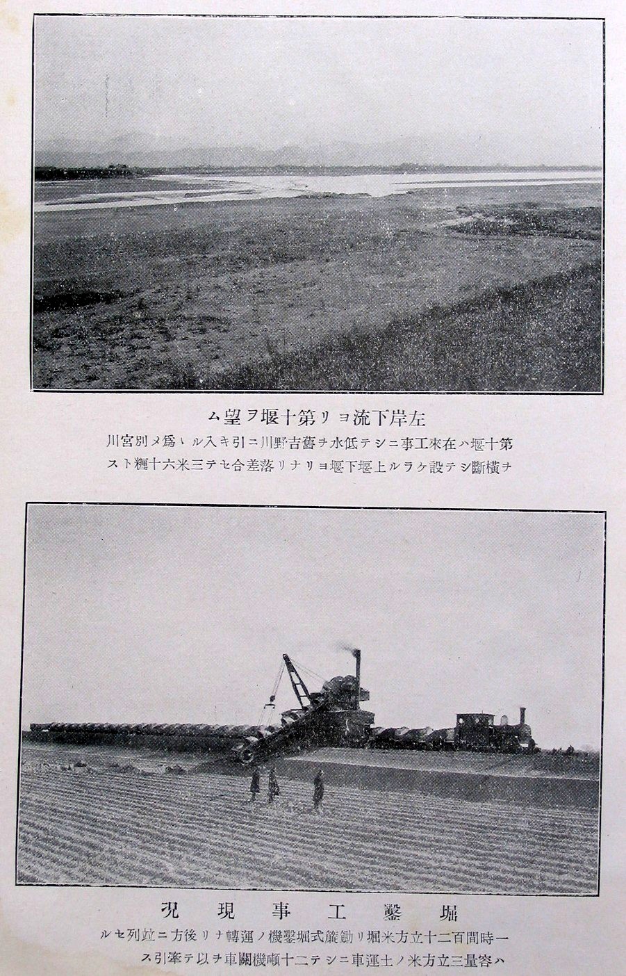 左岸下流ヨリ第十堰ヲ望ム 堀鑿工事現況