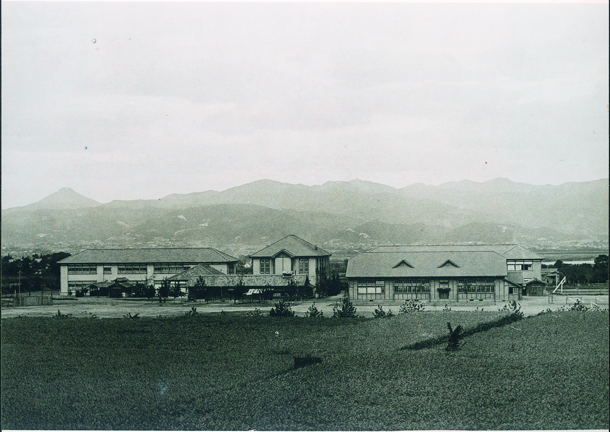 芝生小 「進め仲良く」の標語がある校舎