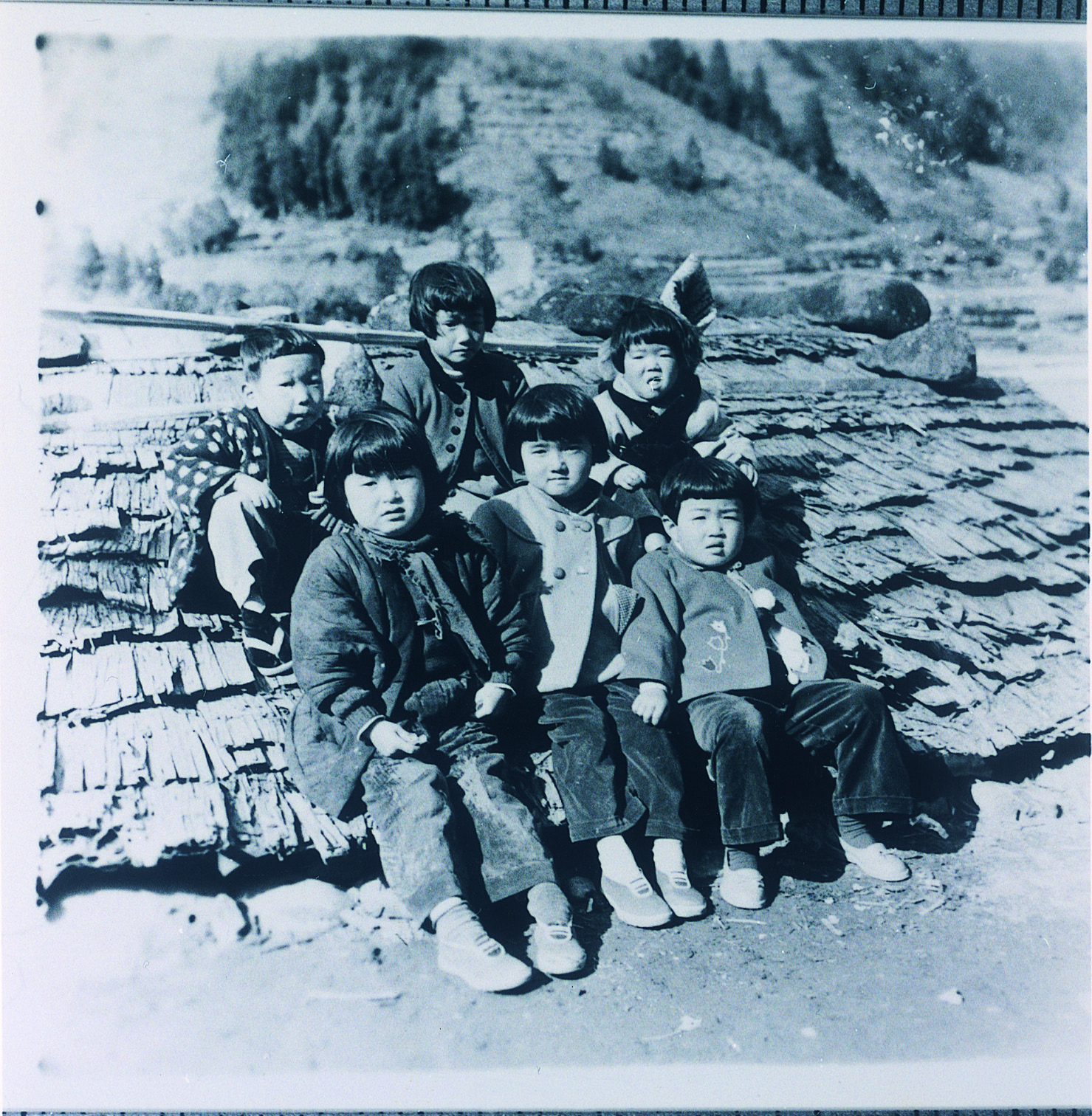南宇 杉皮葺き屋根の小屋と子供たち