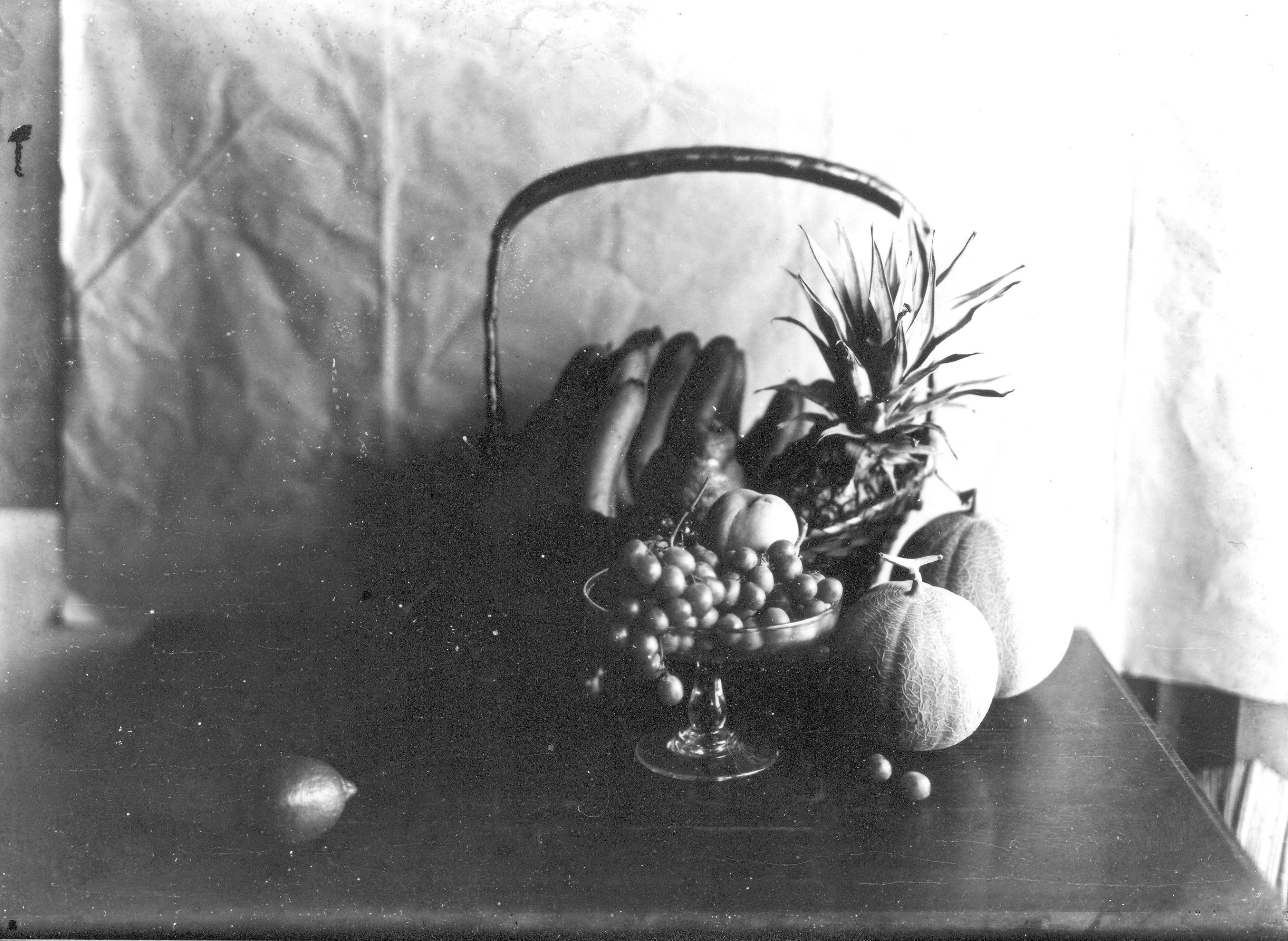 籠に盛られた果物(バナナ・パイナップル・桃・洋なし・ぶどう・メロン)