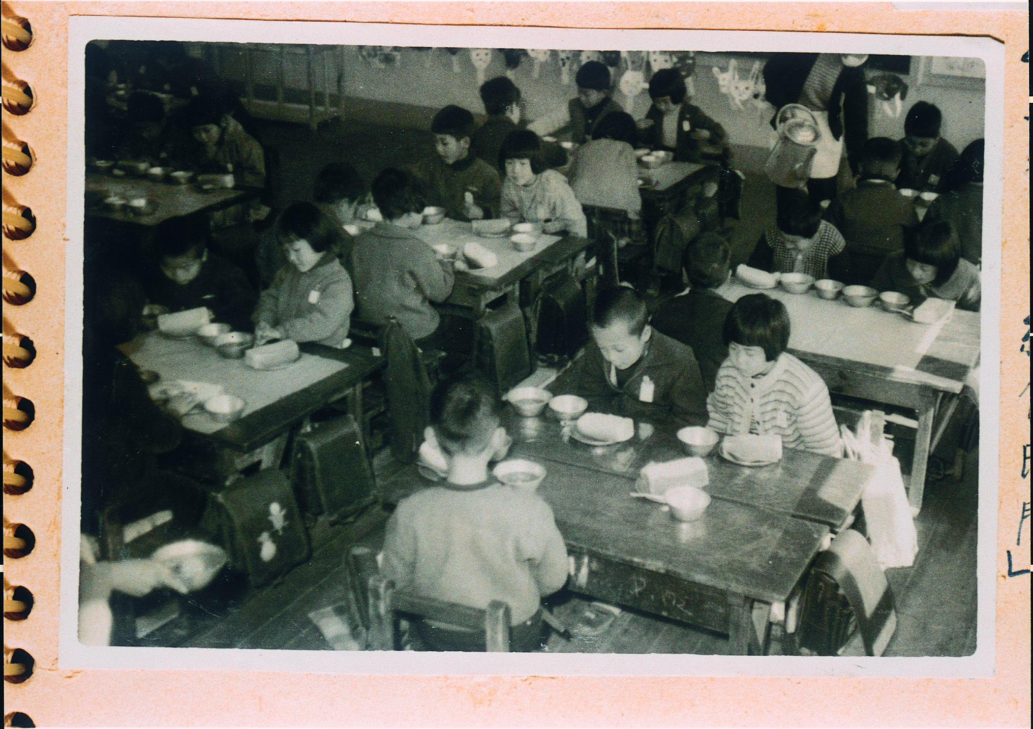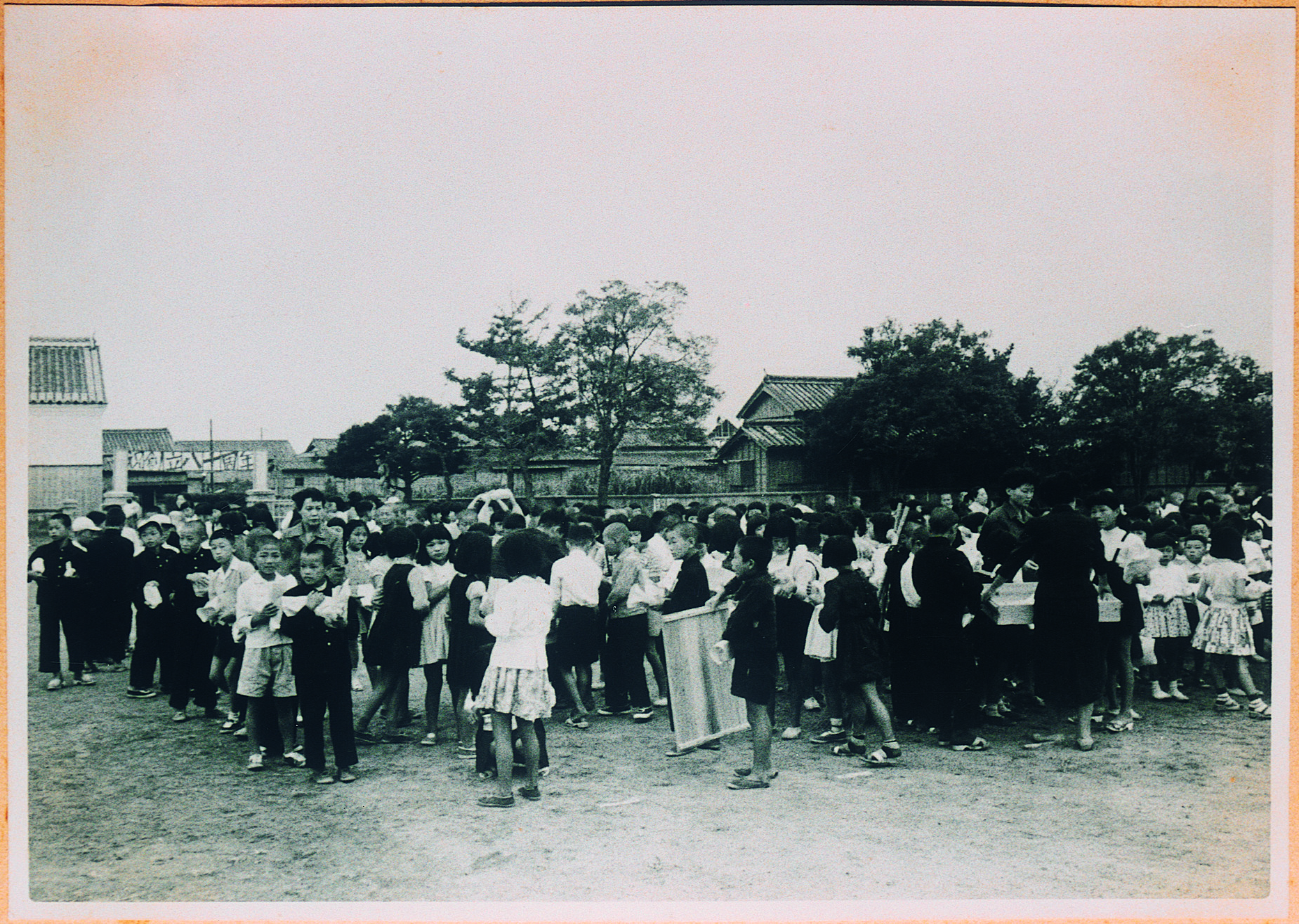 里浦小80周年記念式典 祝賀の饅頭をもらう子供たち