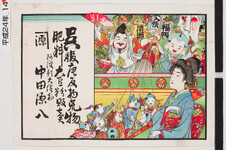 | S0000014116 | 引札絵柄:恵比寿福助の福引き 商店場所:阿波郡大俣村 商店名称:中田源八 商売内容:呉服唐反物荒物肥料大豆粉販売 | 引き札 |
