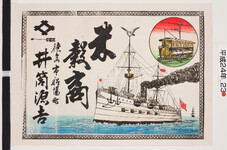 | S0000014123 | 引札絵柄:蒸気船 汽車 商店場所:徳島市船場町 商店名称:井筒源吉 商売内容:米穀商 | 引き札 |