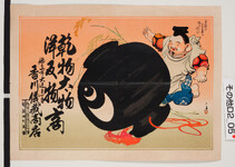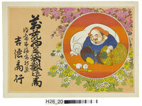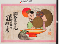 | S0000014241 | 引札絵柄:恵比寿と小槌 商店場所:徳島市大道3丁目 商店名称:香川儀蔵商店 商売内容:乾物太物洋反物商 | 引き札 |