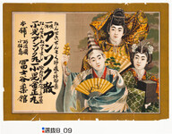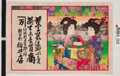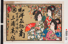 | S0000014152 | 引札絵柄:扇を持つ三人の美女 商店場所:阿波郡市場町 商店名称:三浦商店 商売内容:和洋反物商 | 引き札 |
