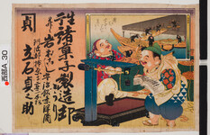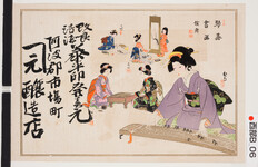 | S0000014154 | 引札絵柄:習い事(琴碁書画)鉄斎の落款 商店場所:阿波郡市場町 商店名称:屋号(かねげん)醸造店か 商売内容:改良清酒 泰平印発売元 | 引き札 |