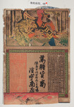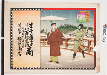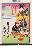 | S0000014247 | 印刷絵柄:赤垣源蔵徳利の別れの場面 小包賃金表 商店場所:阿波郡土成村 商店名称:流高一 商売内容:萬御菓子卸小売 | 引き札 |