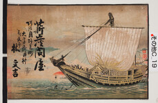 | S0000014227 | 引札絵柄:帆掛け船 商店場所:阿波国撫養町大字斎田村 商店名称:林文吉 商売内容:薪炭問屋 | 引き札 |